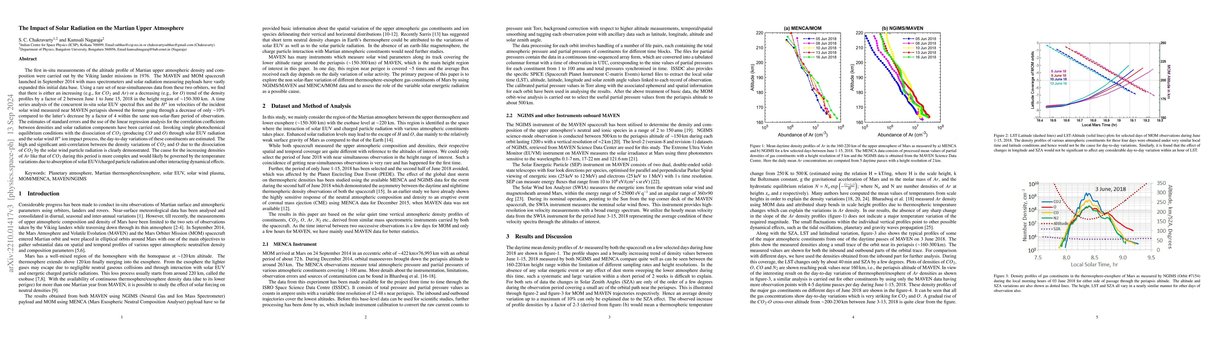This study investigates the influence of solar wind on the Martian upper atmosphere, revealing significant day-to-day variations in Argon, carbon dioxide, and atomic oxygen densities during June 2018. The findings suggest that solar wind energy impacts dissociation and ionization processes, potentially decreasing carbon dioxide and increasing atomic oxygen densities.