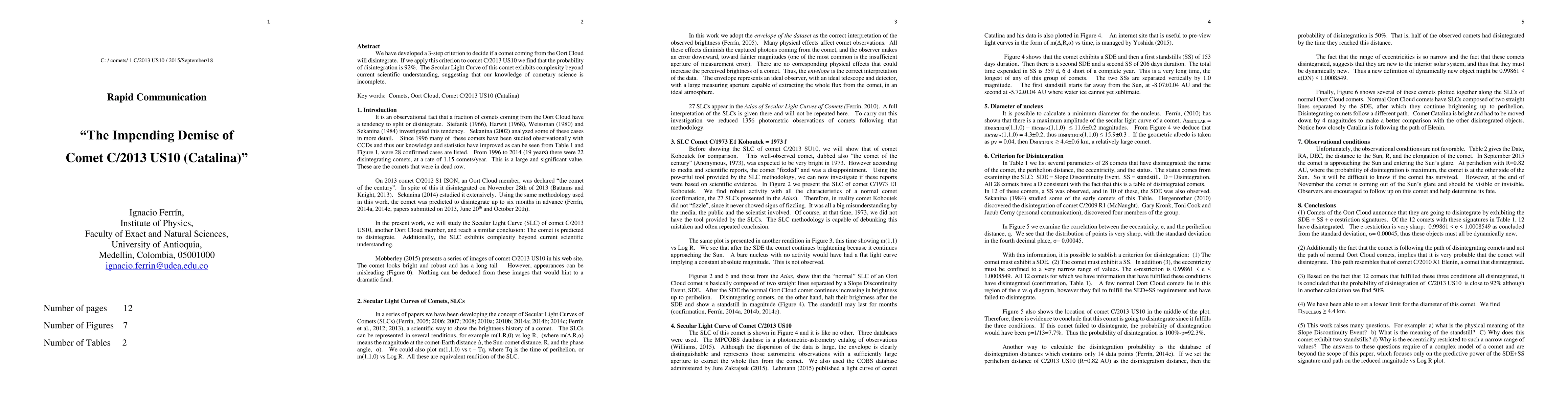 We have developed a 3-step criterion to decide if a comet coming from the Oort Cloud will disintegrate. If we apply this criterion to comet C/2013 US10 we find that the probability of disintegration is 92%. The Secular Light Curve of this comet exhibits complexity beyond current scientific understanding, suggesting that our knowledge of cometary science is incomplete.