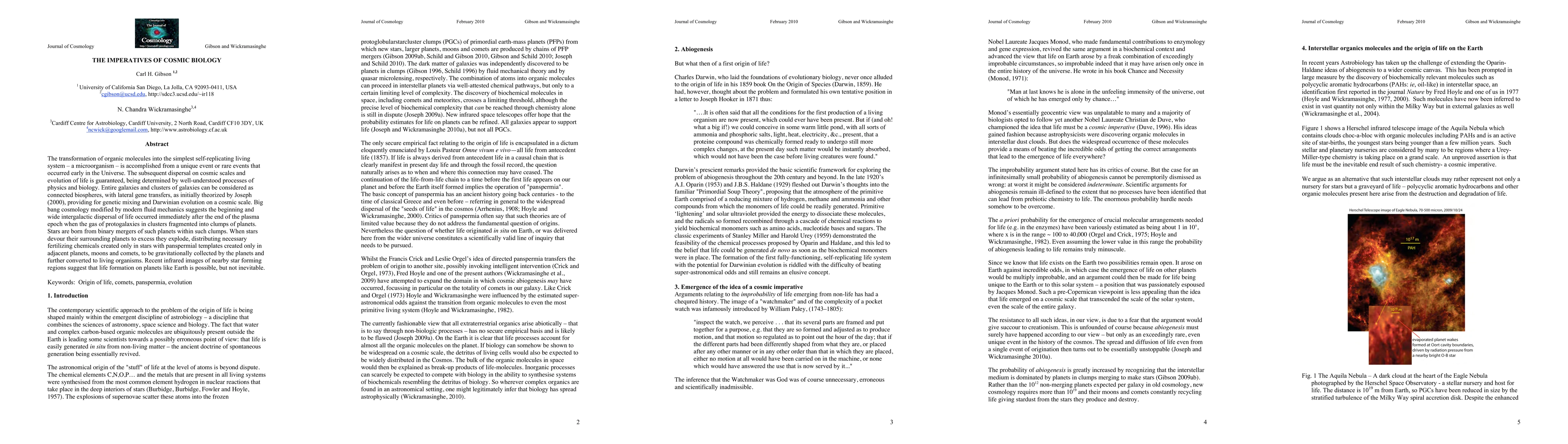 The paper proposes that life's origins stem from unique early universe events, leading to self-replicating microorganisms. It suggests that galaxies and galaxy clusters function as interconnected biospheres, with life evolving via lateral gene transfer on a cosmic scale, supported by big bang cosmology and fluid mechanics. The formation of stars and planets, along with the role of stellar explosions in distributing life-essential chemicals, are also discussed, with recent infrared images indicating potential for life formation on Earth-like planets, though not guaranteed.