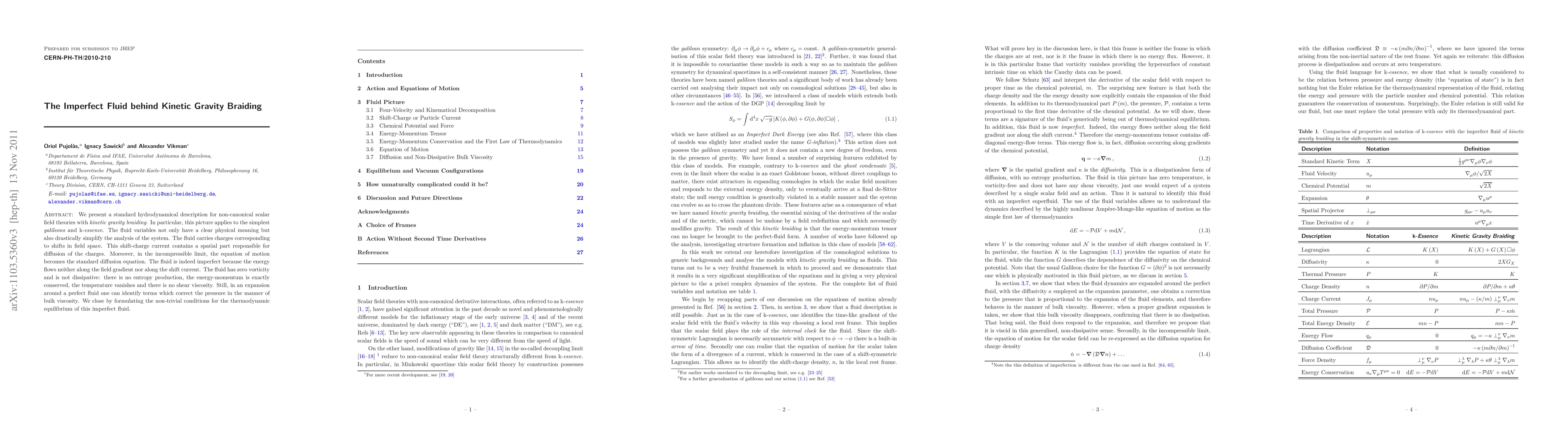 We present a standard hydrodynamical description for non-canonical scalar field theories with kinetic gravity braiding. In particular, this picture applies to the simplest galileons and k-essence. The fluid variables not only have a clear physical meaning but also drastically simplify the analysis of the system. The fluid carries charges corresponding to shifts in field space. This shift-charge current contains a spatial part responsible for diffusion of the charges. Moreover, in the incompressible limit, the equation of motion becomes the standard diffusion equation. The fluid is indeed imperfect because the energy flows neither along the field gradient nor along the shift current. The fluid has zero vorticity and is not dissipative: there is no entropy production, the energy-momentum is exactly conserved, the temperature vanishes and there is no shear viscosity. Still, in an expansion around a perfect fluid one can identify terms which correct the pressure in the manner of bulk viscosity. We close by formulating the non-trivial conditions for the thermodynamic equilibrium of this imperfect fluid.