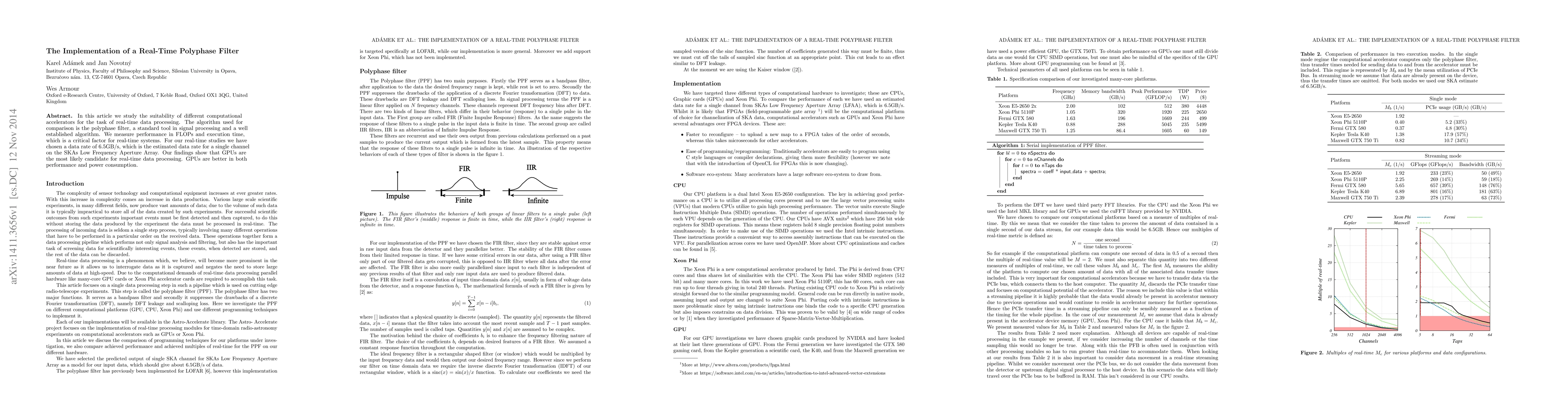 In this article we study the suitability of dierent computational accelerators for the task of real-time data processing. The algorithm used for comparison is the polyphase filter, a standard tool in signal processing and a well established algorithm. We measure performance in FLOPs and execution time, which is a critical factor for real-time systems. For our real-time studies we have chosen a data rate of 6.5GB/s, which is the estimated data rate for a single channel on the SKAs Low Frequency Aperture Array. Our findings how that GPUs are the most likely candidate for real-time data processing. GPUs are better in both performance and power consumption.