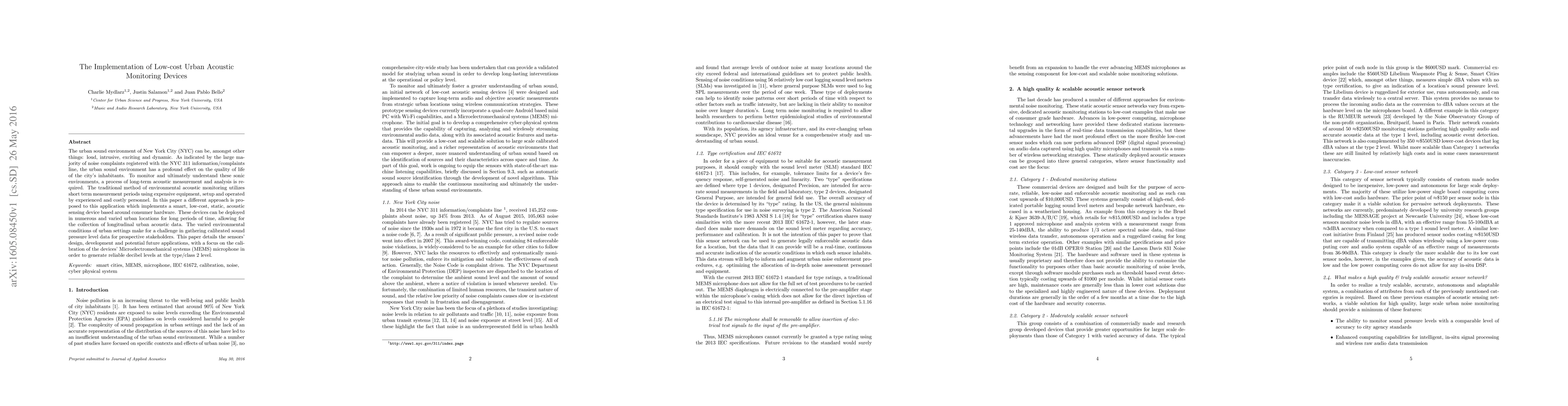 The urban sound environment of New York City (NYC) can be, amongst other things: loud, intrusive, exciting and dynamic. As indicated by the large majority of noise complaints registered with the NYC 311 information/complaints line, the urban sound environment has a profound effect on the quality of life of the city's inhabitants. To monitor and ultimately understand these sonic environments, a process of long-term acoustic measurement and analysis is required. The traditional method of environmental acoustic monitoring utilizes short term measurement periods using expensive equipment, setup and operated by experienced and costly personnel. In this paper a different approach is proposed to this application which implements a smart, low-cost, static, acoustic sensing device based around consumer hardware. These devices can be deployed in numerous and varied urban locations for long periods of time, allowing for the collection of longitudinal urban acoustic data. The varied environmental conditions of urban settings make for a challenge in gathering calibrated sound pressure level data for prospective stakeholders. This paper details the sensors' design, development and potential future applications, with a focus on the calibration of the devices' Microelectromechanical systems (MEMS) microphone in order to generate reliable decibel levels at the type/class 2 level.