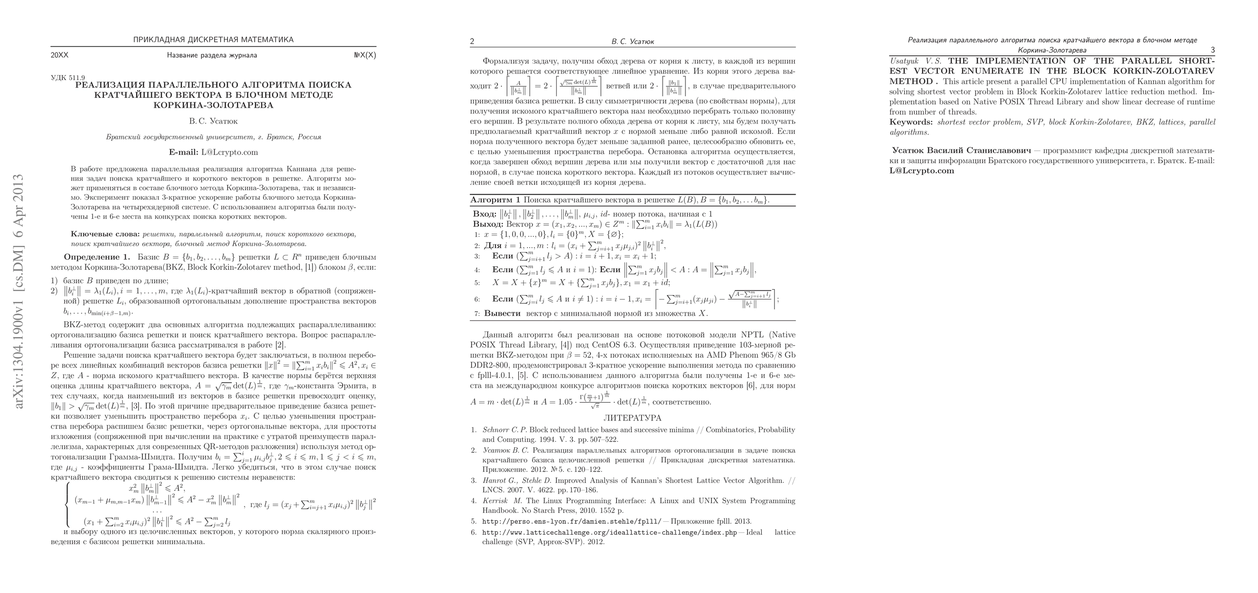 Summary: This paper details a parallel CPU implementation of the Kannan algorithm for the shortest vector problem within the Block Korkin-Zolotarev lattice reduction method, utilizing the Native POSIX Thread Library, which demonstrates a linear reduction in runtime with increasing thread count.