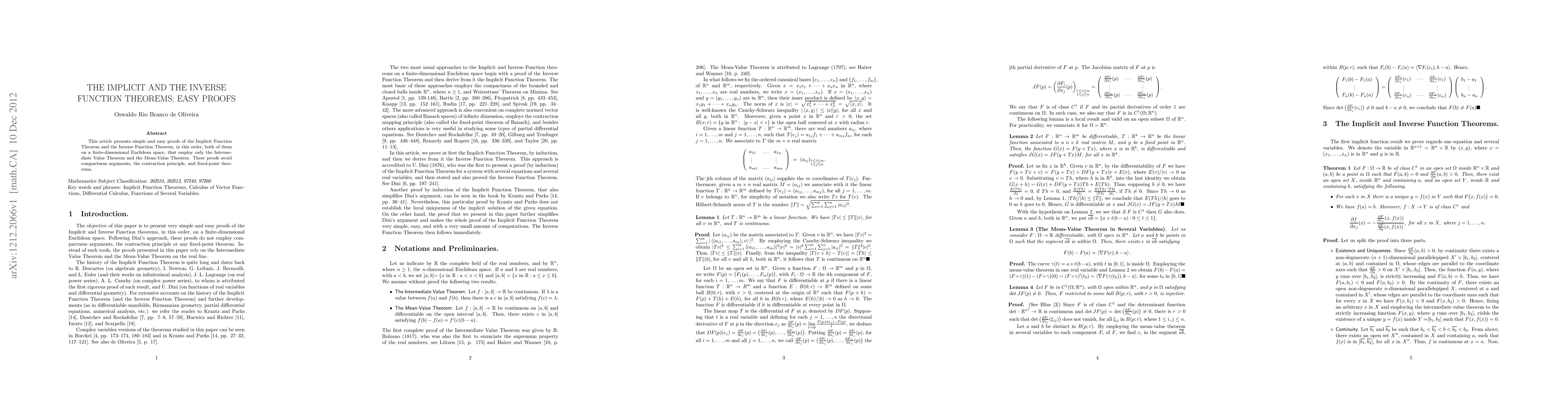 Summary: This paper offers straightforward proofs of the Implicit Function Theorem and the Inverse Function Theorem using only the Intermediate Value Theorem and the Mean-Value Theorem, eschewing complex compactness or fixed-point arguments.