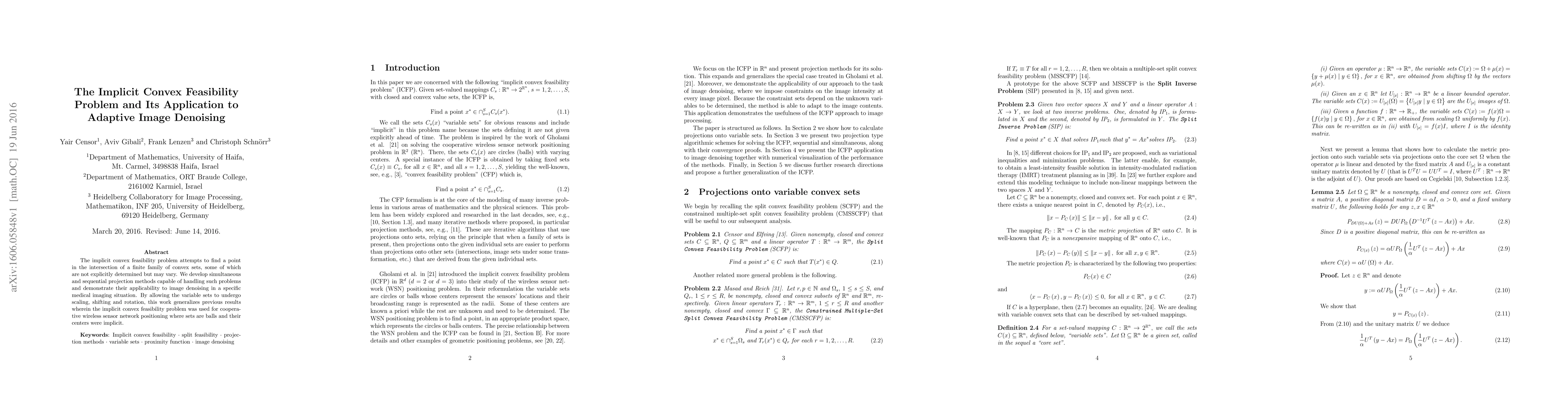 This paper develops methods for solving the implicit convex feasibility problem, which involves finding a point in the intersection of implicitly determined convex sets. It applies these methods to adaptive image denoising in medical imaging, generalizing previous work on wireless sensor network positioning.
