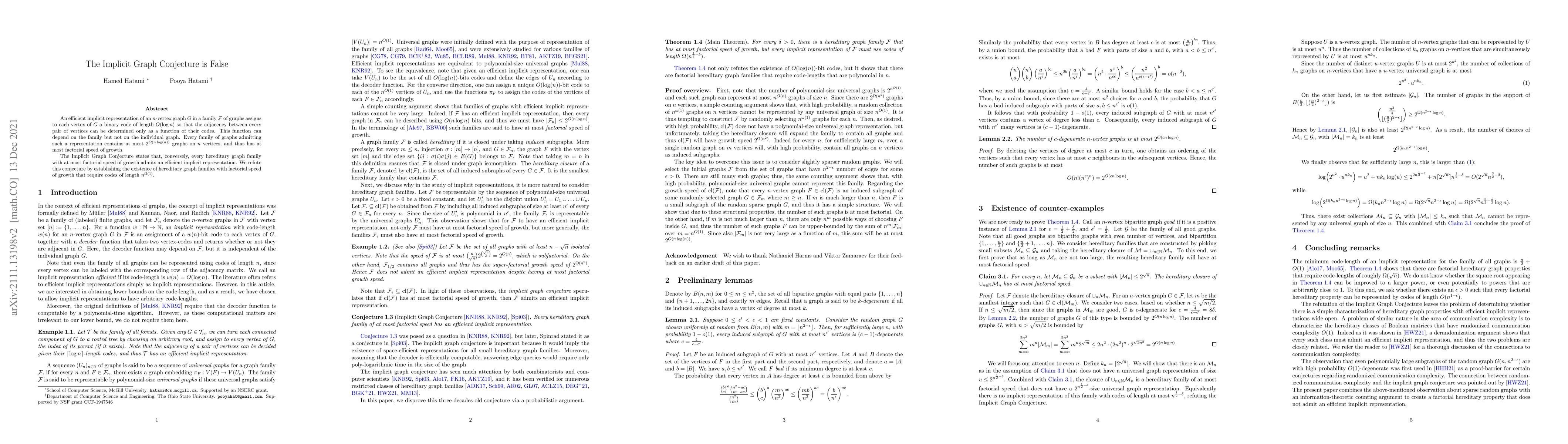 The paper disproves the Implicit Graph Conjecture via a probabilistic argument, constructing a hereditary graph family with factorial speed of growth that requires codes of length n^Ω(1).