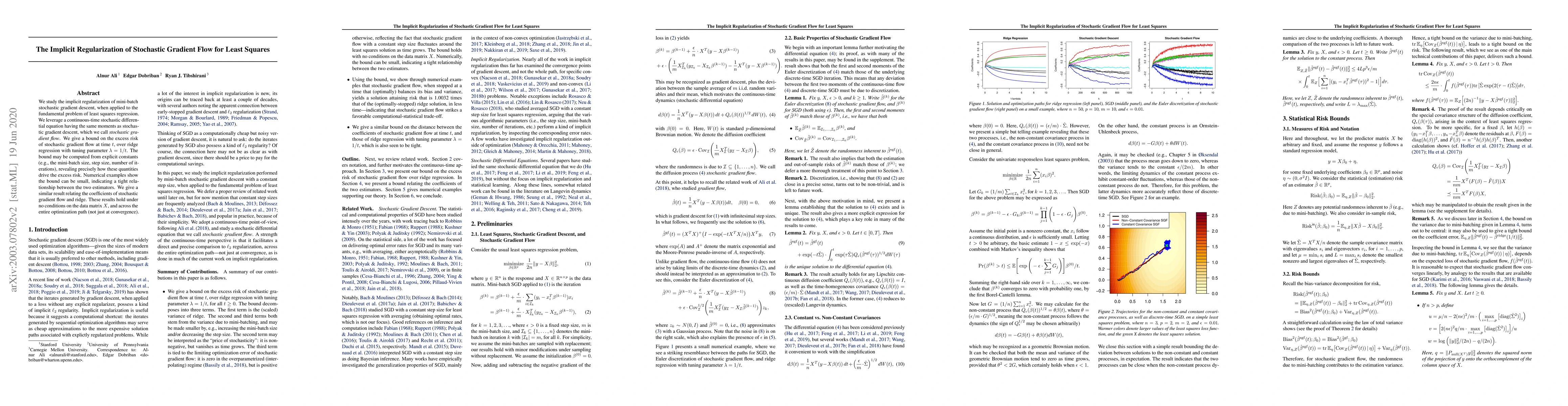 This paper explores the implicit regularization effect of mini-batch stochastic gradient descent for least squares regression, showing that it behaves similarly to ridge regression. The authors provide a bound on the excess risk of stochastic gradient flow, demonstrating its tight relationship with ridge regression across the entire optimization path.