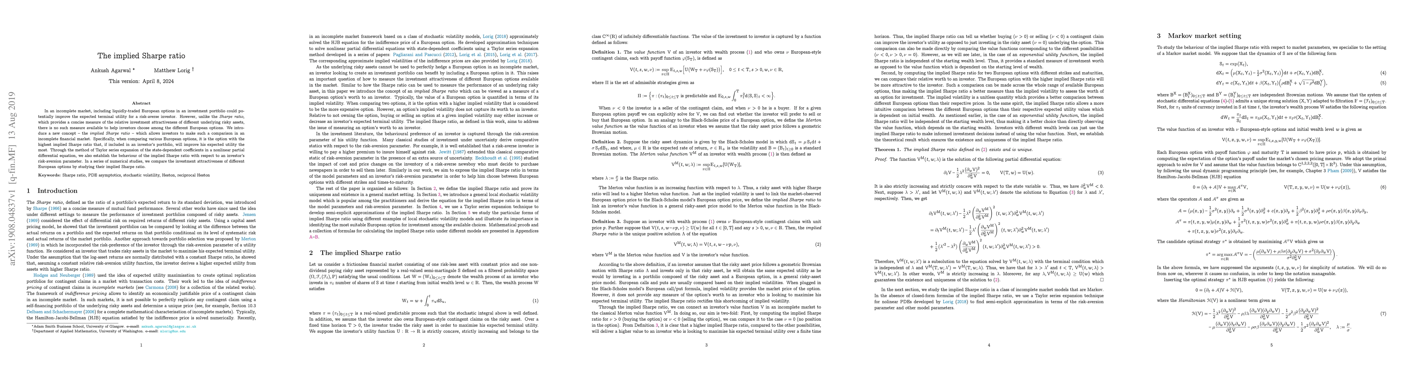 In an incomplete market, including liquidly-traded European options in an investment portfolio could potentially improve the expected terminal utility for a risk-averse investor. However, unlike the Sharpe ratio, which provides a concise measure of the relative investment attractiveness of different underlying risky assets, there is no such measure available to help investors choose among the different European options. We introduce a new concept -- the implied Sharpe ratio -- which allows investors to make such a comparison in an incomplete financial market. Specifically, when comparing various European options, it is the option with the highest implied Sharpe ratio that, if included in an investor's portfolio, will improve his expected utility the most. Through the method of Taylor series expansion of the state-dependent coefficients in a nonlinear partial differential equation, we also establish the behaviour of the implied Sharpe ratio with respect to an investor's risk-aversion parameter. In a series of numerical studies, we compare the investment attractiveness of different European options by studying their implied Sharpe ratio.