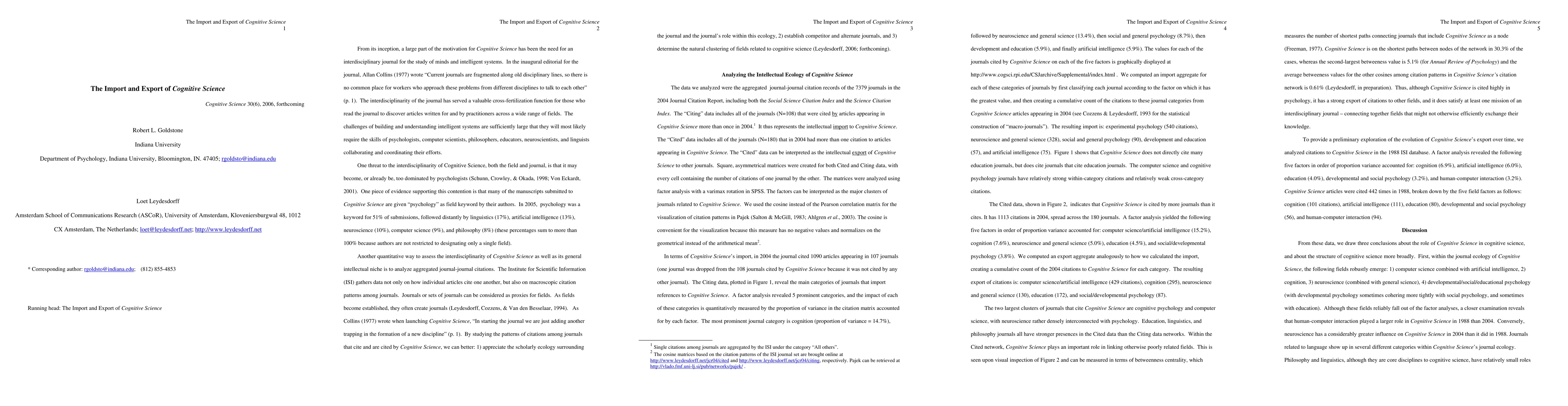 This paper examines the interdisciplinary nature of Cognitive Science, highlighting the dominance of psychology in submissions and the need to maintain a diverse scholarly ecology. It analyzes citation patterns among journals to understand the field's scholarly relationships, identify competing journals, and determine the clustering of related disciplines.