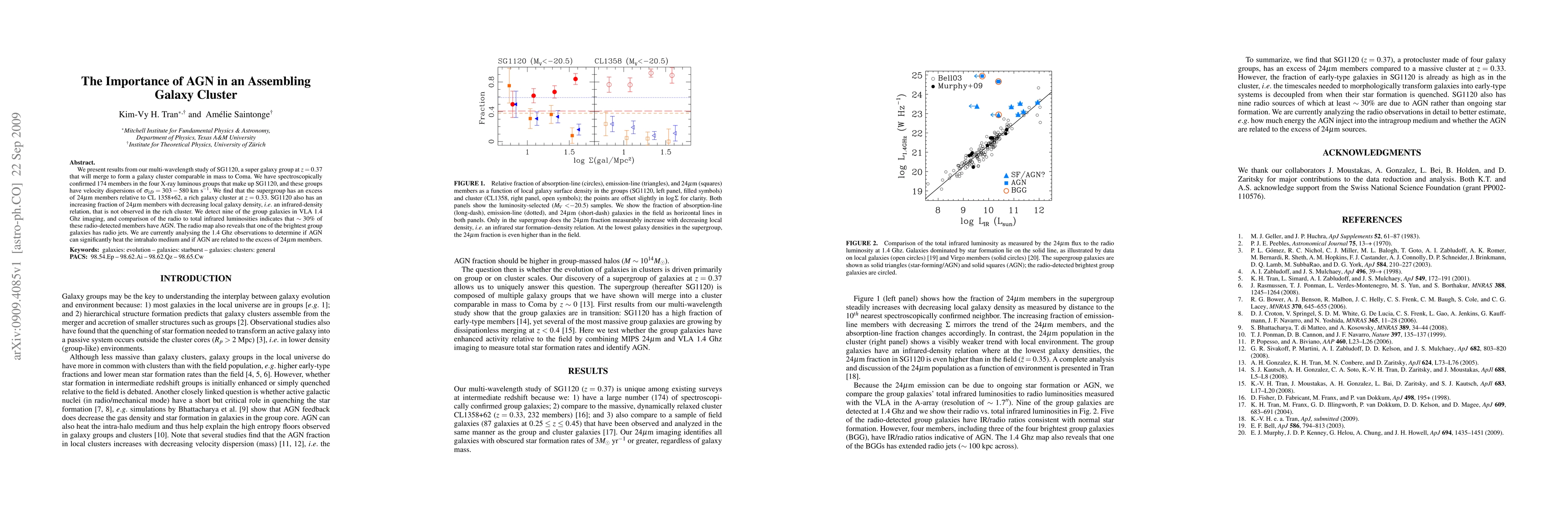 We present results from our multi-wavelength study of SG1120, a super galaxy group at z=0.37, that will merge to form a galaxy cluster comparable in mass to Coma. We have spectroscopically confirmed 174 members in the four X-ray luminous groups that make up SG1120, and these groups have velocity dispersions of sigma(1D)=303-580 km/s. We find that the supergroup has an excess of 24 micron members relative to CL1358+62, a rich galaxy cluster at z=0.33. SG1120 also has an increasing fraction of 24 micron members with decreasing local galaxy density, i.e. an infrared-density relation, that is not observed in the rich cluster. We detect nine of the group galaxies in VLA 1.4 Ghz imaging, and comparison of the radio to total infrared luminosities indicates that about 30% of these radio-detected members have AGN. The radio map also reveals that one of the brightest group galaxies has radio jets. We are currently analysing the 1.4 Ghz observations to determine if AGN can significantly heat the intrahalo medium and if AGN are related to the excess of 24 micron members.