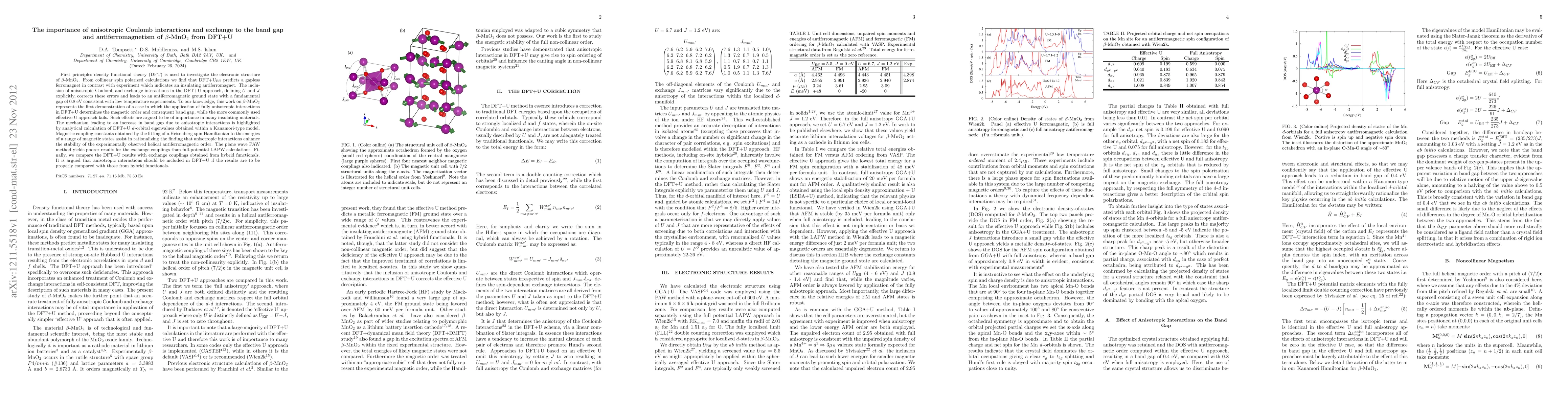 First principles density functional theory (DFT) is used to investigate the electronic structure of \beta-MnO2. From collinear spin polarized calculations we find that DFT+U_Eff predicts a gapless ferromagnet in contrast with experiment which indicates an insulating antiferromagnet. The inclusion of anisotropic Coulomb and exchange interactions in the DFT+U approach, defining U and J explicitly, corrects these errors and leads to an antiferromagnetic ground state with a fundamental gap of 0.8 eV consistent with low temperature experiments. To our knowledge, this work on \beta-MnO2 represents the first demonstration of a case in which the application of fully anisotropic interactions in DFT+U determines the magnetic order and consequent band gap, while the more commonly used effective U approach fails. Such effects are argued to be of importance in many insulating materials. The mechanism leading to an increase in band gap due to anisotropic interactions is highlighted by analytical calculation of DFT+U d-orbital eigenvalues obtained within a Kanamori-type model. Magnetic coupling constants obtained by the fitting of a Heisenberg spin Hamiltonian to the energies of a range of magnetic states assist in rationalizing the finding that anisotropic interactions enhance the stability of the experimentally observed helical antiferromagnetic order. The plane wave PAW method yields poorer results for the exchange couplings than full-potential LAPW calculations. Finally, we compare the DFT+U results with exchange couplings obtained from hybrid functionals. It is argued that anisotropic interactions should be included in DFT+U if the results are to be properly compared with those from hybrid functionals.