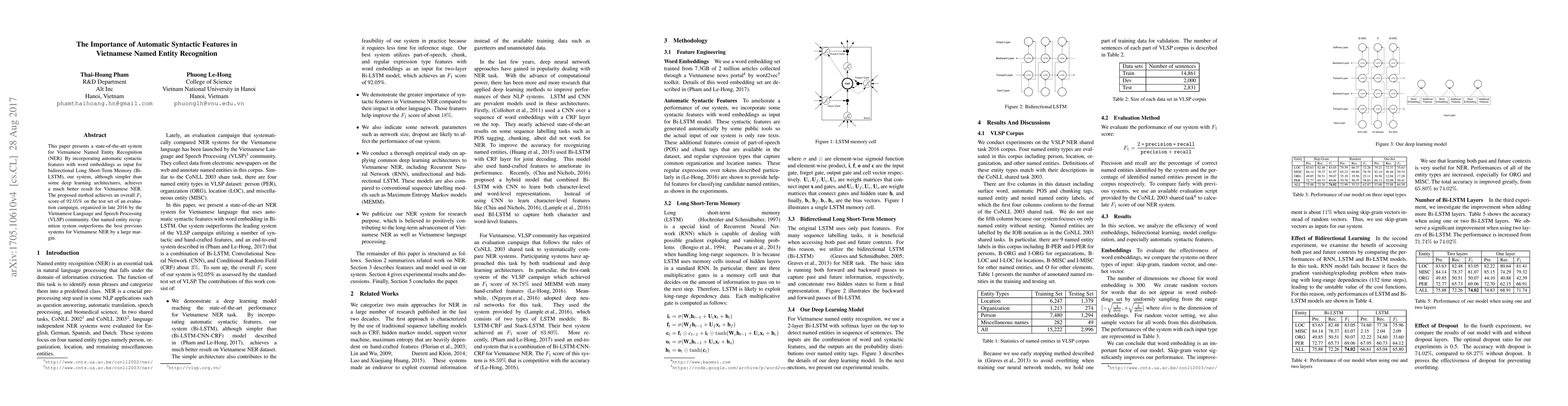 The paper introduces a superior Vietnamese Named Entity Recognition (NER) system utilizing automatic syntactic features and word embeddings within a Bi-LSTM model, achieving a high F1 score of 92.05%. This method significantly outperforms previous systems, highlighting the importance of syntactic features in NER tasks.