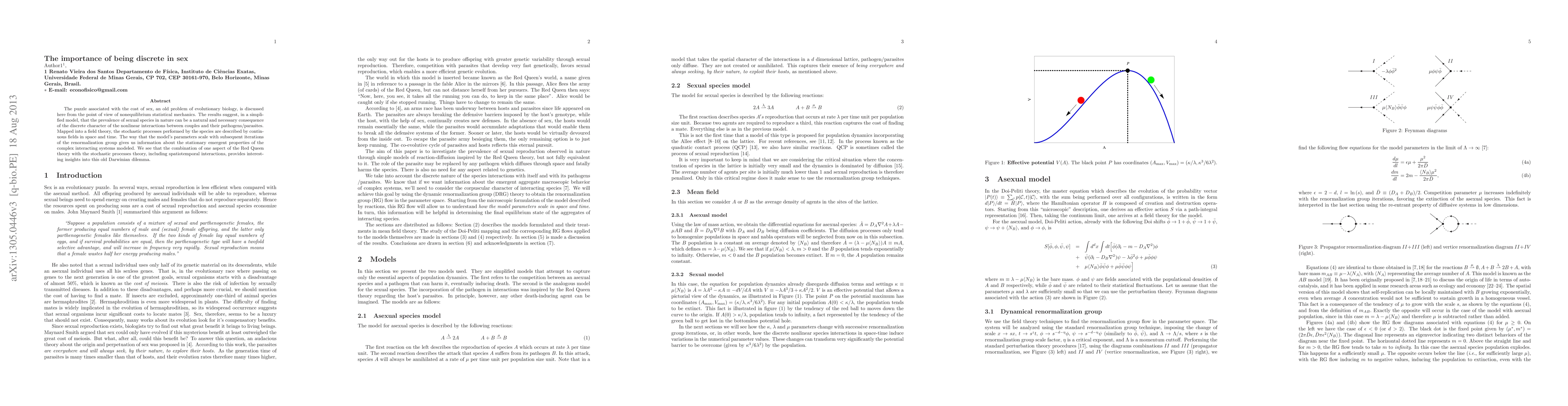 The puzzle associated with the cost of sex, an old problem of evolutionary biology, is discussed here from the point of view of nonequilibrium statistical mechanics. The results suggest, in a simplified model, that the prevalence of sexual species in nature can be a natural and necessary consequence of the discrete character of the nonlinear interactions between couples and their pathogens/parasites. Mapped into a field theory, the stochastic processes performed by the species are described by continuous fields in space and time. The way that the model's parameters scale with subsequent iterations of the renormalization group gives us information about the stationary emergent properties of the complex interacting systems modeled. We see that the combination of one aspect of the Red Queen theory with the stochastic processes theory, including spatiotemporal interactions, provides interesting insights into this old Darwinian dilemma.