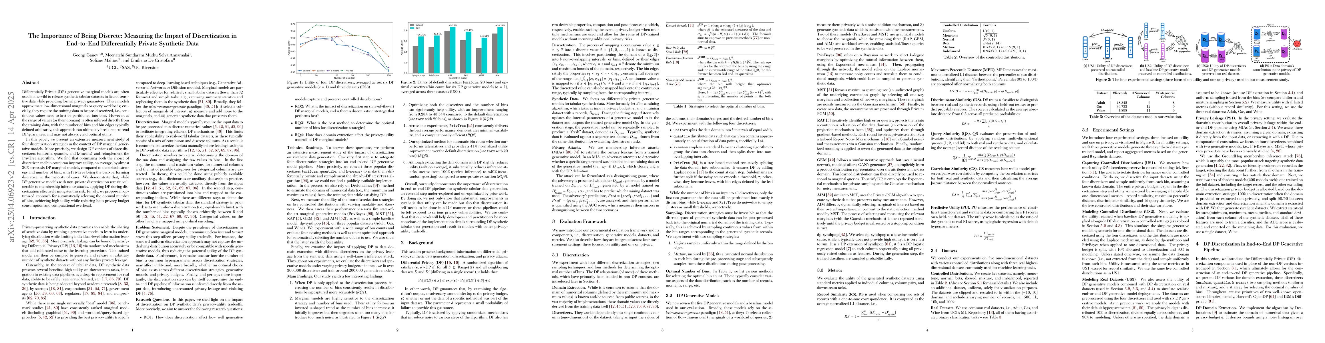 The paper presents an extensive measurement study of four discretization strategies in the context of Differentially Private (DP) marginal generative models. It designs DP versions of three discretizers (uniform, quantile, and k-means) and reimplements the PrivTree algorithm, evaluating their performance across six DP marginal models.