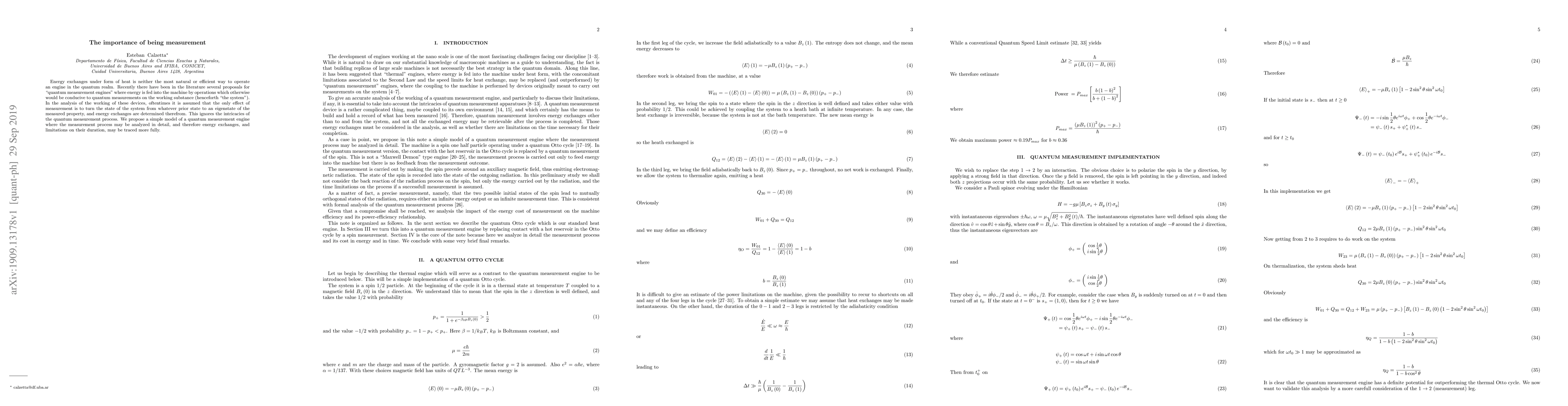 Energy exchanges under form of heat is neither the most natural or efficient way to operate an engine in the quantum realm. Recently there have been in the literature several proposals for "quantum measurement engines" where energy is fed into the machine by operations which otherwise would be conducive to quantum measurements on the working substance (henceforth "the system"). In the analysis of the working of these devices, oftentimes it is assumed that the only effect of measurement is to turn the state of the system from whatever prior state to an eigenstate of the measured property, and energy exchanges are determined therefrom. This ignores the intricacies of the quantum measurement process. We propose a simple model of a quantum measurement engine where the measurement process may be analyzed in detail, and therefore energy exchanges, and limitations on their duration, may be traced more fully.