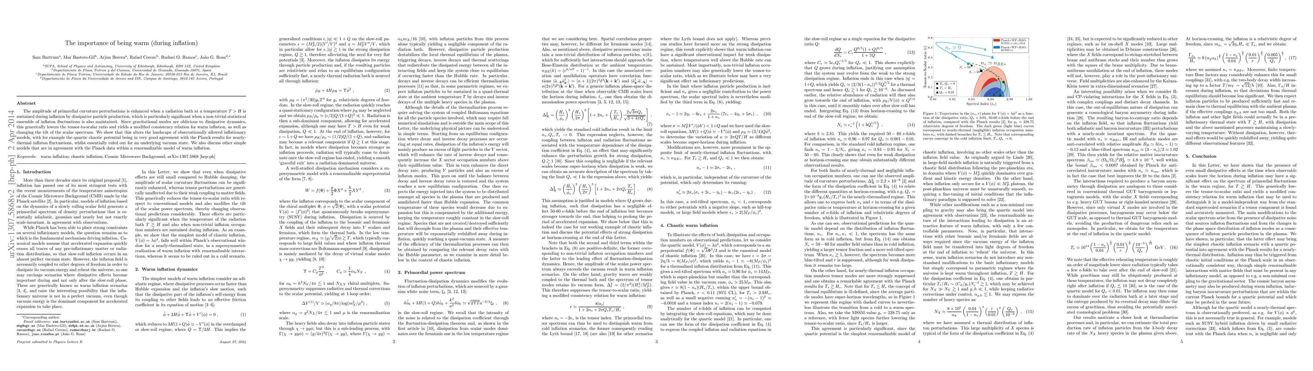 This paper explores how maintaining a warm radiation bath during inflation, via dissipative particle production, enhances primordial curvature perturbations, alters the tensor-to-scalar ratio, and modifies the scalar spectrum's tilt. It finds that warm inflation models, particularly those with nearly-thermal inflaton fluctuations, better fit Planck data compared to vacuum-state models.