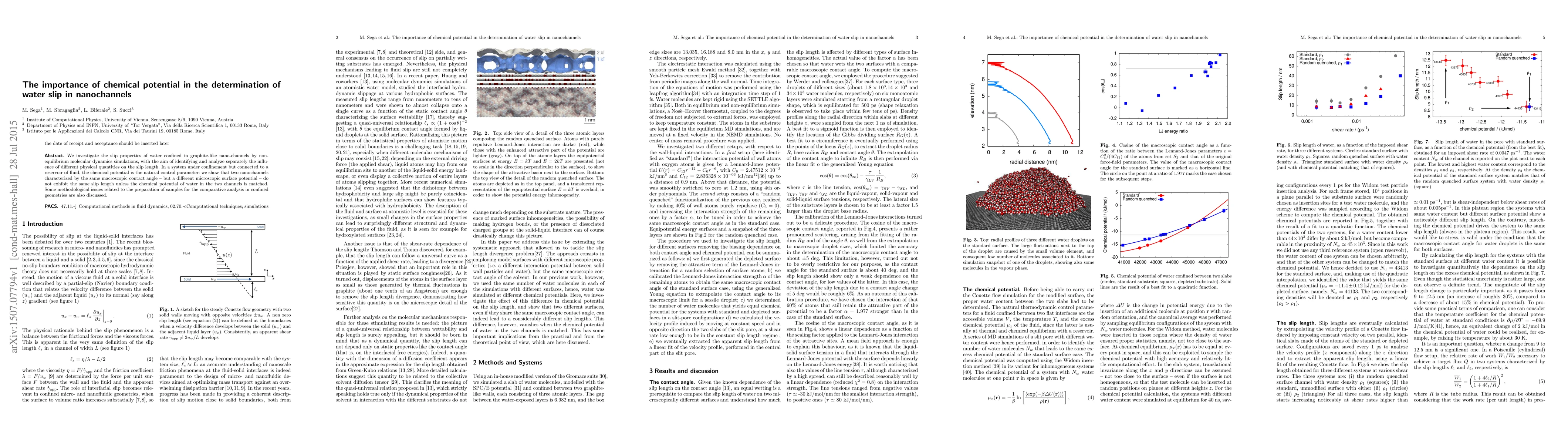 This paper uses molecular dynamics simulations to study water slip in nanochannels, finding that chemical potential significantly influences slip length. It highlights that channels with identical macroscopic contact angles but different surface potentials will not have the same slip unless their chemical potentials are matched.