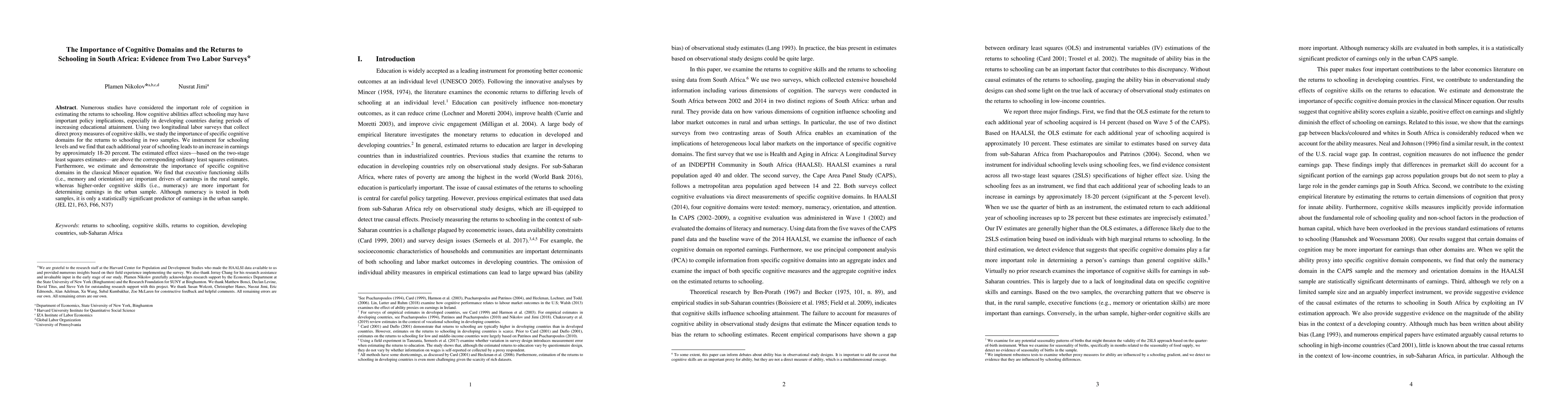Numerous studies have considered the important role of cognition in estimating the returns to schooling. How cognitive abilities affect schooling may have important policy implications, especially in developing countries during periods of increasing educational attainment. Using two longitudinal labor surveys that collect direct proxy measures of cognitive skills, we study the importance of specific cognitive domains for the returns to schooling in two samples. We instrument for schooling levels and we find that each additional year of schooling leads to an increase in earnings by approximately 18-20 percent. The estimated effect sizes-based on the two-stage least squares estimates-are above the corresponding ordinary least squares estimates. Furthermore, we estimate and demonstrate the importance of specific cognitive domains in the classical Mincer equation. We find that executive functioning skills (i.e., memory and orientation) are important drivers of earnings in the rural sample, whereas higher-order cognitive skills (i.e., numeracy) are more important for determining earnings in the urban sample. Although numeracy is tested in both samples, it is only a statistically significant predictor of earnings in the urban sample.