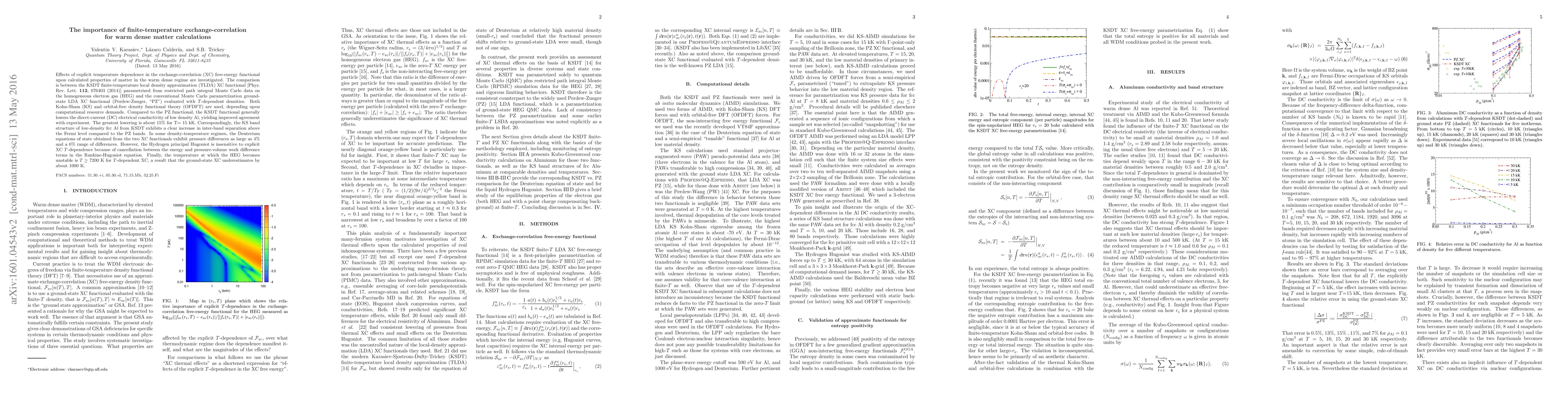 Effects of explicit temperature dependence in the exchange-correlation (XC) free-energy functional upon calculated properties of matter in the warm dense regime are investigated. The comparison is between the KSDT finite-temperature local density approximation (TLDA) XC functional [Phys.\ Rev.\ Lett.\ \textbf{112}, 076403 (2014)] parametrized from restricted path integral Monte Carlo data on the homogeneous electron gas (HEG) and the conventional Monte Carlo parametrization ground-state LDA XC functional (Perdew-Zunger, "PZ") evaluated with $T$-dependent densities. Both Kohn-Sham (KS) and orbital-free density functional theory (OFDFT) are used, depending upon computational resource demands. Compared to the PZ functional, the KSDT functional generally lowers the direct-current (DC) electrical conductivity of low density Al, yielding improved agreement with experiment. The greatest lowering is about 15\% for T= 15 kK. Correspondingly, the KS band structure of low-density fcc Al from KSDT exhibits a clear increase in inter-band separation above the Fermi level compared to the PZ bands. In some density-temperature regimes, the Deuterium equations of state obtained from the two XC functionals exhibit pressure differences as large as 4\% and a 6\% range of differences. However, the Hydrogen principal Hugoniot is insensitive to explicit XC $T$-dependence because of cancellation between the energy and pressure-volume work difference terms in the Rankine-Hugoniot equation. Finally, the temperature at which the HEG becomes unstable is $T\geq$ 7200 K for $T$-dependent XC, a result that the ground-state XC underestimates by about 1000 K.
