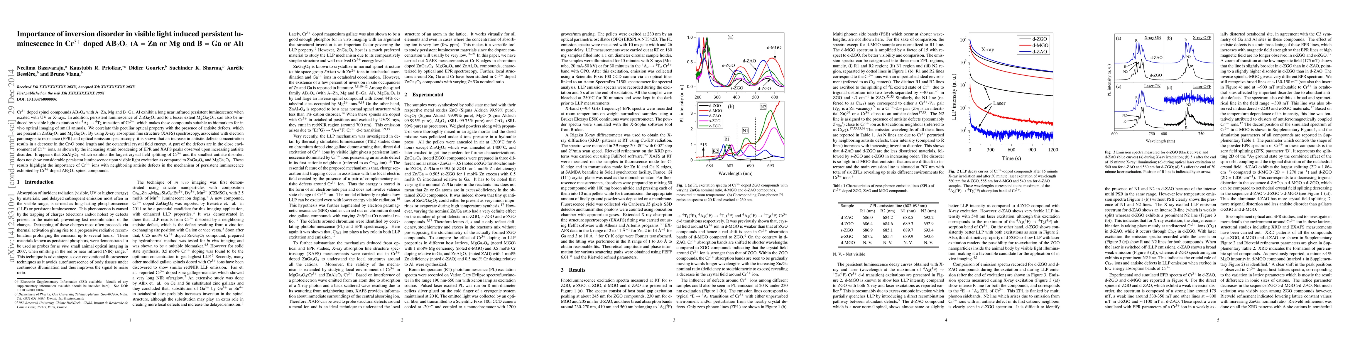 This paper investigates the role of inversion disorder in Cr$^{3+}$ doped spinel compounds AB$_2$O$_4$ (A = Zn or Mg, B = Ga or Al) that exhibit persistent luminescence when excited by visible light. The study finds that compounds with antisite defects, particularly ZnGa$_2$O$_4$ and MgGa$_2$O$_4$, show enhanced visible light induced persistent luminescence due to the presence of Cr$^{3+}$ ions near these defects, which alters the Cr-O bond length and crystal field energy.