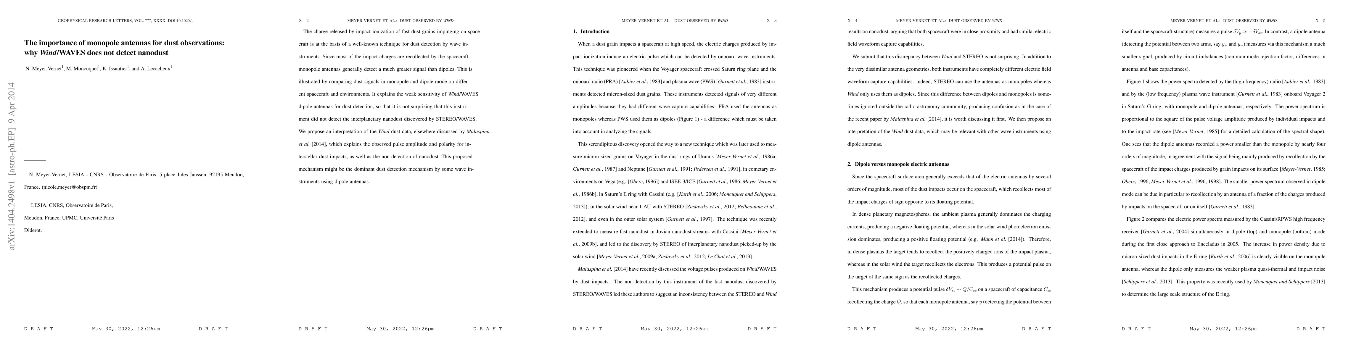 This paper explains why monopole antennas are more effective for dust detection than dipole antennas due to greater signal collection from impact ionization charges, and discusses the Wind/WAVES instrument's weak sensitivity to nanodust, attributing this to its dipole antenna design.