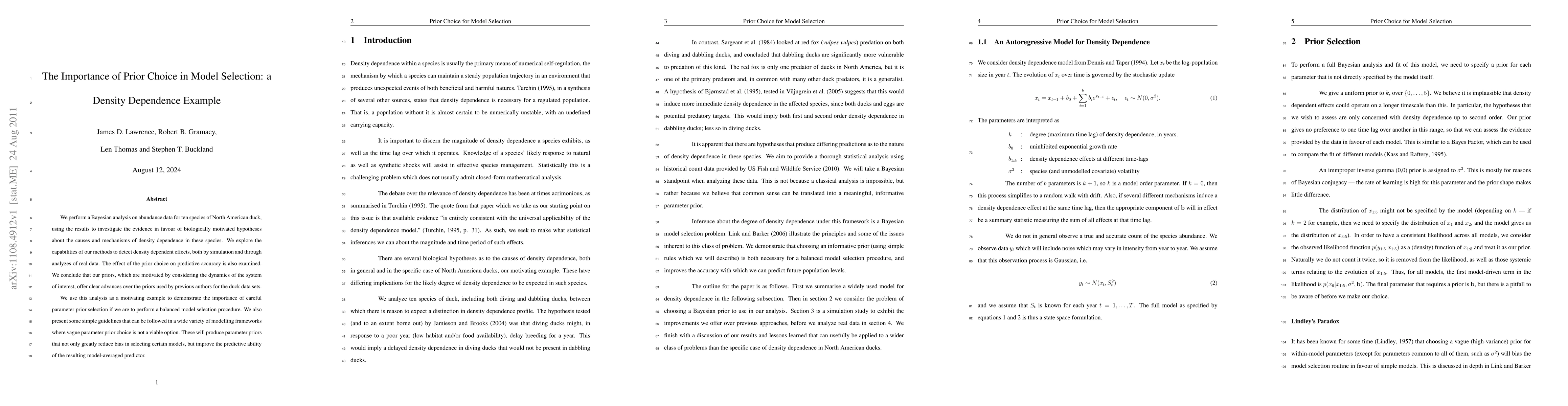 We perform a Bayesian analysis on abundance data for ten species of North American duck, using the results to investigate the evidence in favour of biologically motivated hypotheses about the causes and mechanisms of density dependence in these species. We explore the capabilities of our methods to detect density dependent effects, both by simulation and through analyzes of real data. The effect of the prior choice on predictive accuracy is also examined. We conclude that our priors, which are motivated by considering the dynamics of the system of interest, offer clear advances over the priors used by previous authors for the duck data sets. We use this analysis as a motivating example to demonstrate the importance of careful parameter prior selection if we are to perform a balanced model selection procedure. We also present some simple guidelines that can be followed in a wide variety of modelling frameworks where vague parameter prior choice is not a viable option. These will produce parameter priors that not only greatly reduce bias in selecting certain models, but improve the predictive ability of the resulting model-averaged predictor.