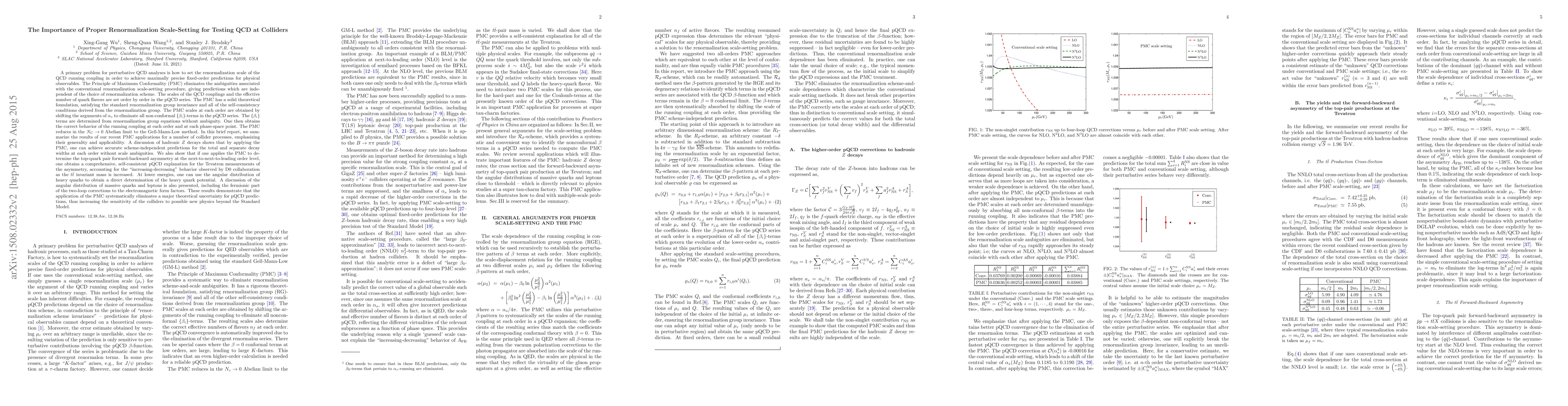 A primary problem for perturbative QCD analyses is how to set the renormalization scale of the QCD running coupling in order to achieve maximally precise fixed-order predictions for physical observables. The Principle of Maximum Conformality (PMC) eliminates the ambiguities associated with the conventional renormalization scale-setting procedure, giving predictions which are independent of the choice of renormalization scheme. The scales of the QCD couplings and the effective number of quark flavors are set order by order in the pQCD series. The PMC has a solid theoretical foundation, satisfying the standard renormalization group invariance and all of the the self-consistency conditions derived from the renormalization group......In this brief report, we summarize the results of our recent PMC applications for a number of collider processes, emphasizing their generality and applicability....... These results demonstrate that the application of the PMC systematically eliminates a major theoretical uncertainty for pQCD predictions, thus increasing the sensitivity of the colliders to possible new physics beyond the Standard Model.