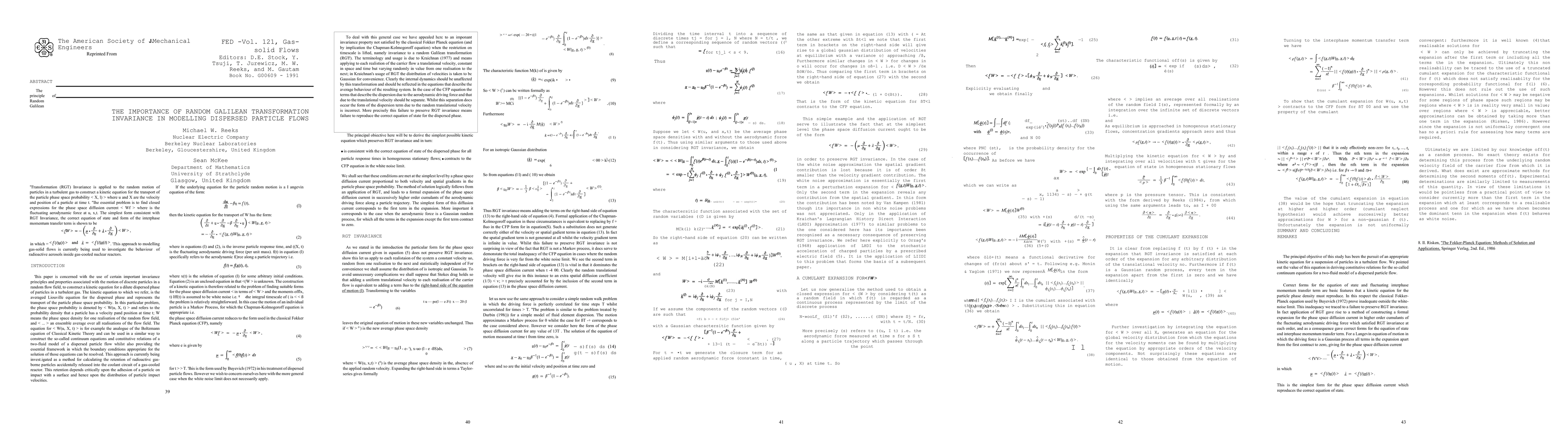 This paper explores the application of Random Galilean Transformation Invariance to model dispersed particle flows in turbulent gases, deriving a kinetic equation that describes the transport of particle phase space probability. The study finds that the simplest form consistent with this invariance leads to a specific equation for the phase space dispersion current, which is crucial for modeling gas-solid flows, including radioactive aerosols in gas-cooled nuclear reactors.