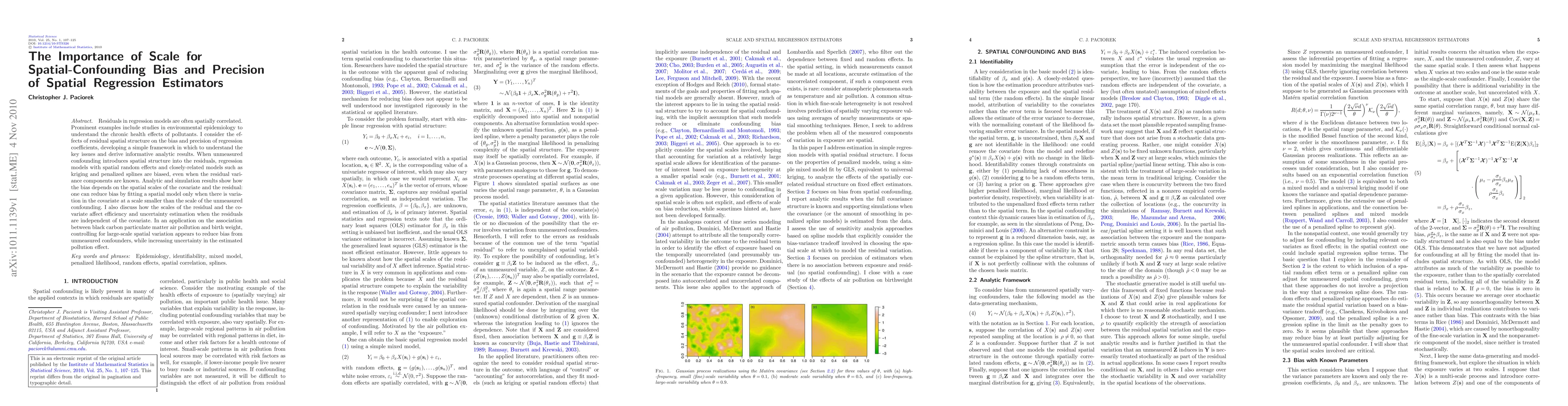 This paper examines how spatial scale influences the bias and precision of spatial regression estimators, particularly in environmental epidemiology. It finds that spatial models are biased when unmeasured confounding introduces spatial structure into residuals, and that reducing bias requires fitting spatial models when covariate variation is smaller than the scale of unmeasured confounding.