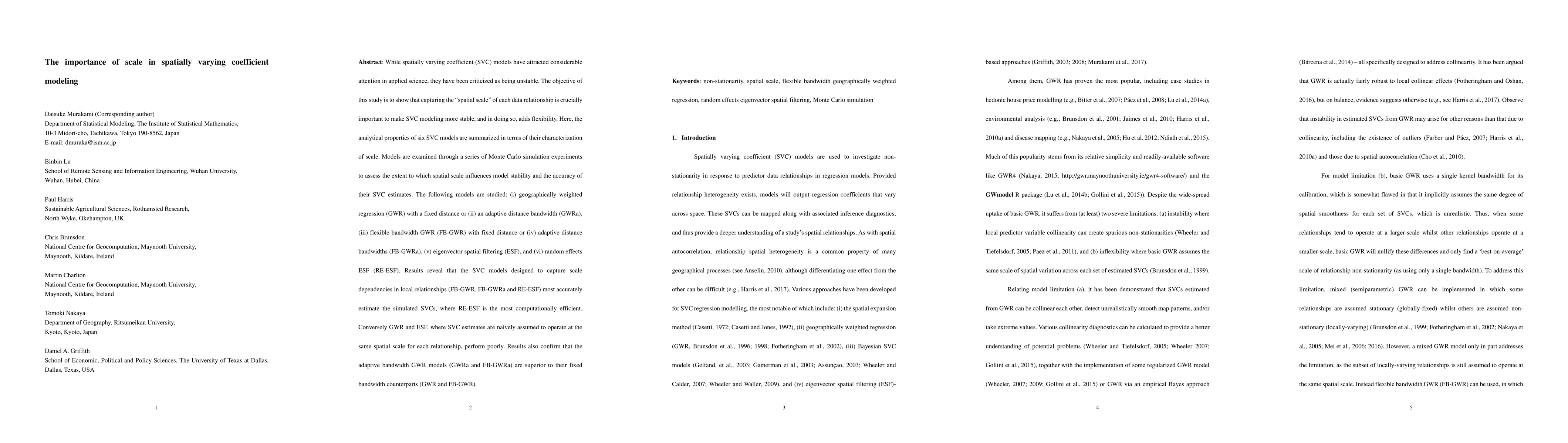 This study investigates the importance of spatial scale in spatially varying coefficient (SVC) models to enhance their stability and flexibility. Through Monte Carlo simulations, it finds that models capturing scale dependencies (FB-GWR, FB-GWRa, and RE-ESF) provide more accurate SVC estimates, with RE-ESF being the most efficient, while models assuming uniform spatial scales (GWR and ESF) perform poorly. Adaptive bandwidth models (GWRa and FB-GWRa) outperform their fixed counterparts.