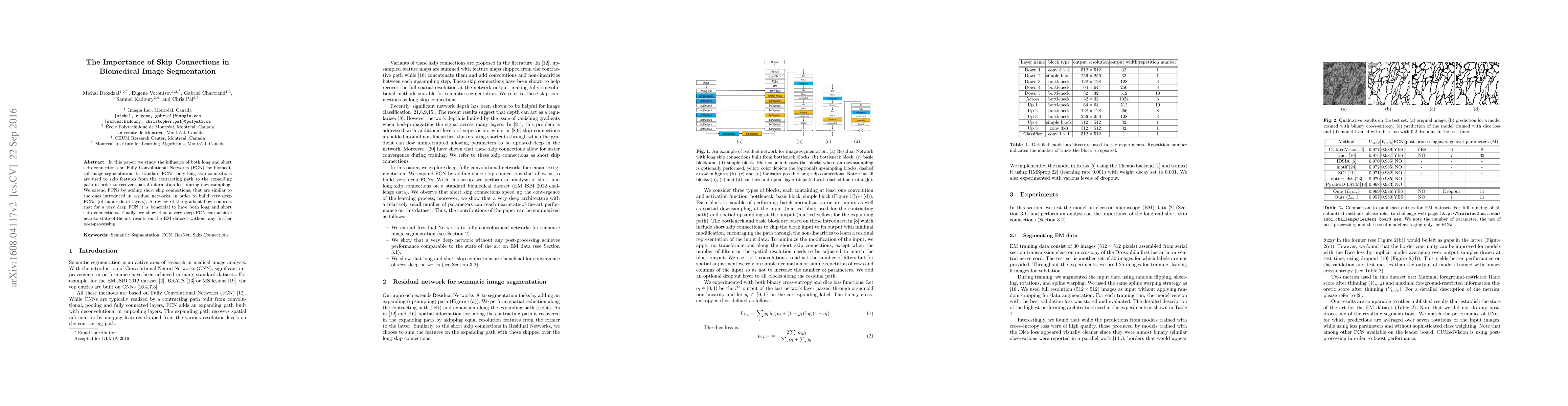 This paper examines the impact of long and short skip connections on Fully Convolutional Networks (FCN) for biomedical image segmentation, extending FCNs by incorporating short skip connections similar to residual networks to build very deep FCNs (hundreds of layers).