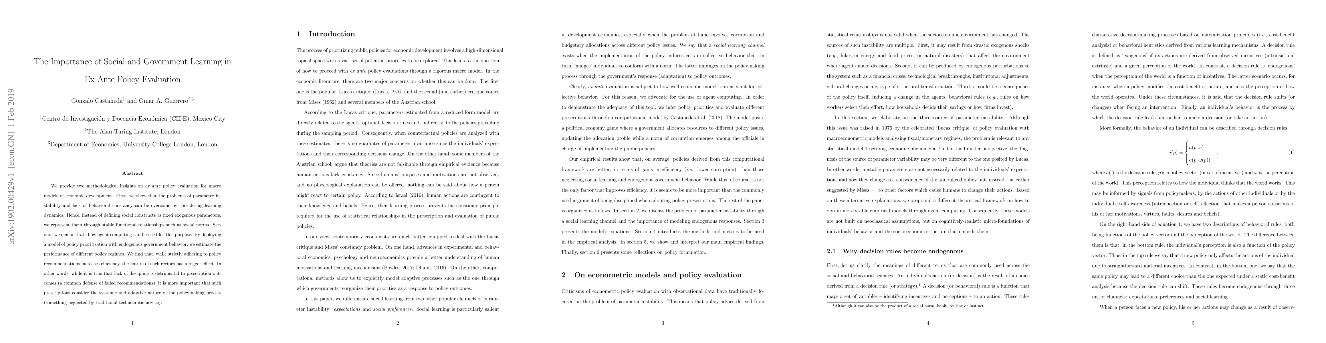 This paper explores methodological improvements for \emph{ex ante} policy evaluation in economic development models, emphasizing the role of learning dynamics to address parameter instability. It proposes agent computing to model endogenous government behavior and finds that policy efficiency depends more on the nature of policy recommendations than on strict adherence to them.