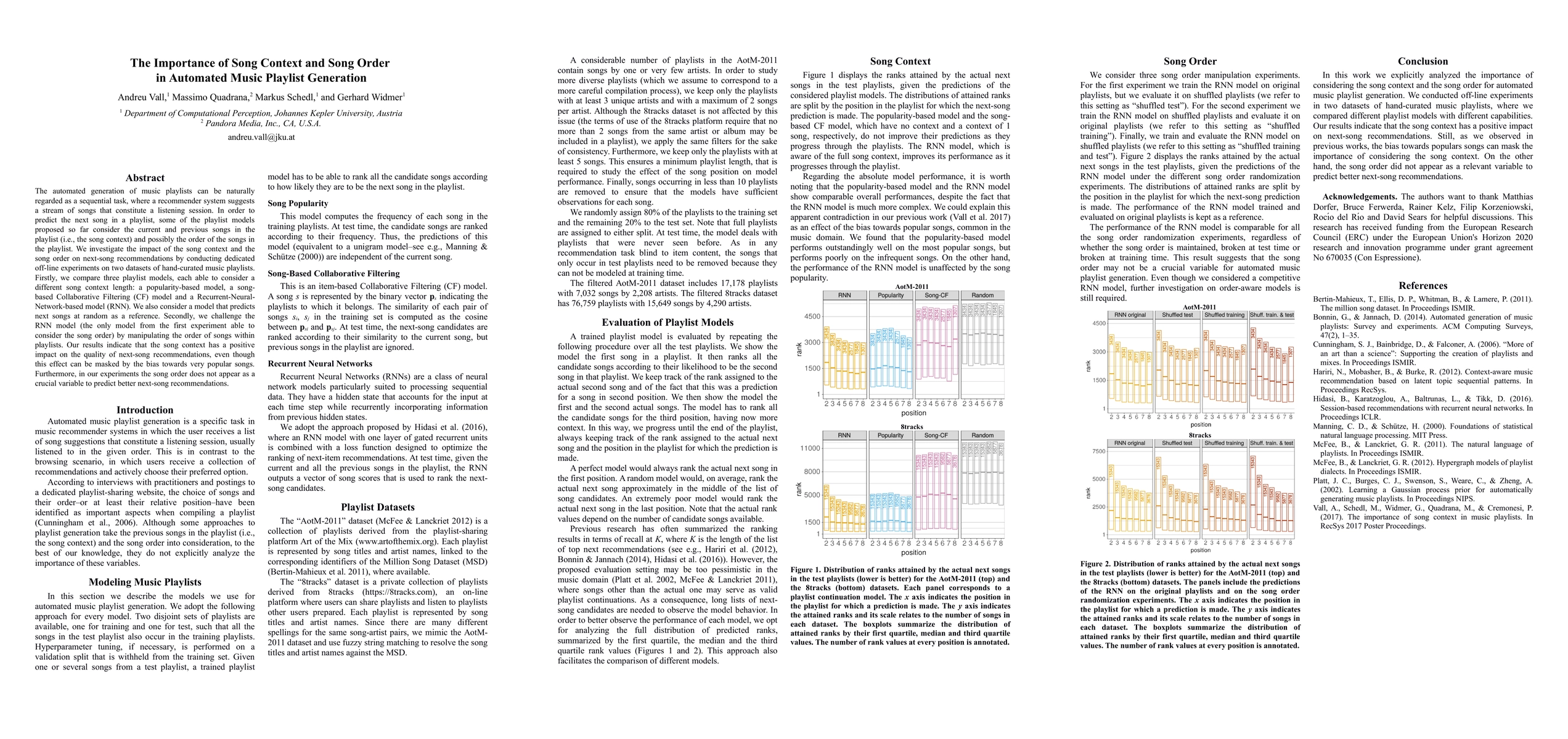 The paper investigates how song context and song order influence automated music playlist generation, finding that while song context enhances recommendation quality, song order does not significantly affect it. Models incorporating context, especially RNNs, outperformed those without, but popularity biases can obscure these benefits.