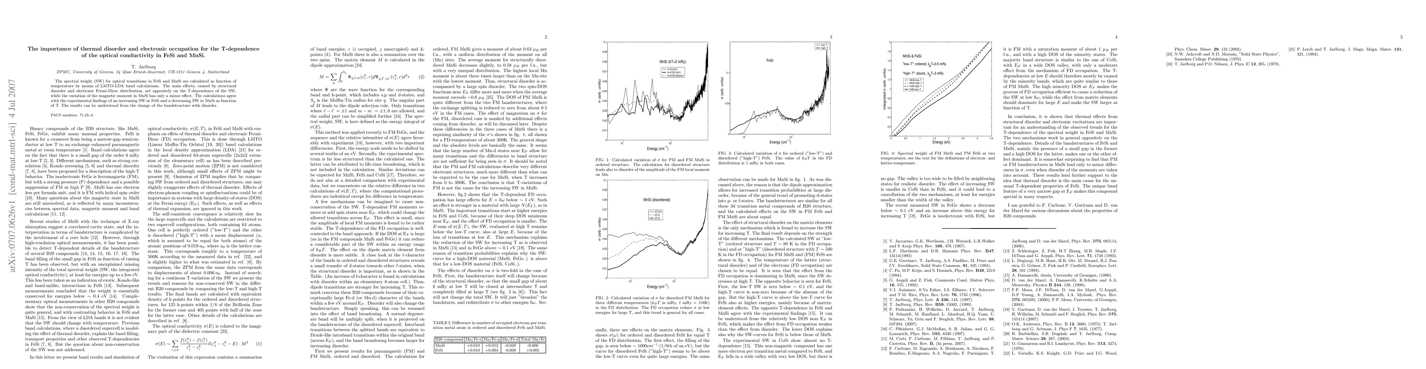 The spectral weight (SW) for optical transitions in FeSi and MnSi are calculated as function of temperature by means of LMTO-LDA band calculations. The main effects, caused by structural disorder and electronic Fermi-Dirac distribution, act oppositely on the T-dependence of the SW, while the variation of the magnetic moment in MnSi has only a minor effect. The calculations agree with the experimental findings of an increasing SW in FeSi and a decreasing SW in MnSi as function of T. The results can be understood from the change of the bandstructure with disorder.