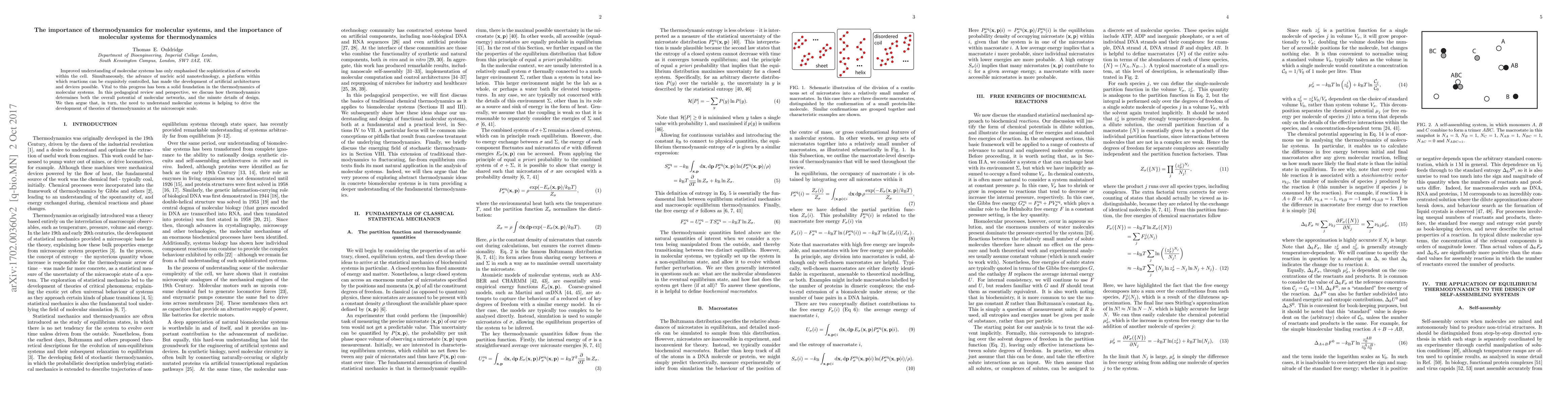 The importance of thermodynamics for molecular systems is highlighted in this review, which explores how a solid foundation in thermodynamics has enabled the development of artificial architectures and devices. The paper also argues that advances in understanding molecular systems are driving new theories of thermodynamics at the microscopic scale.