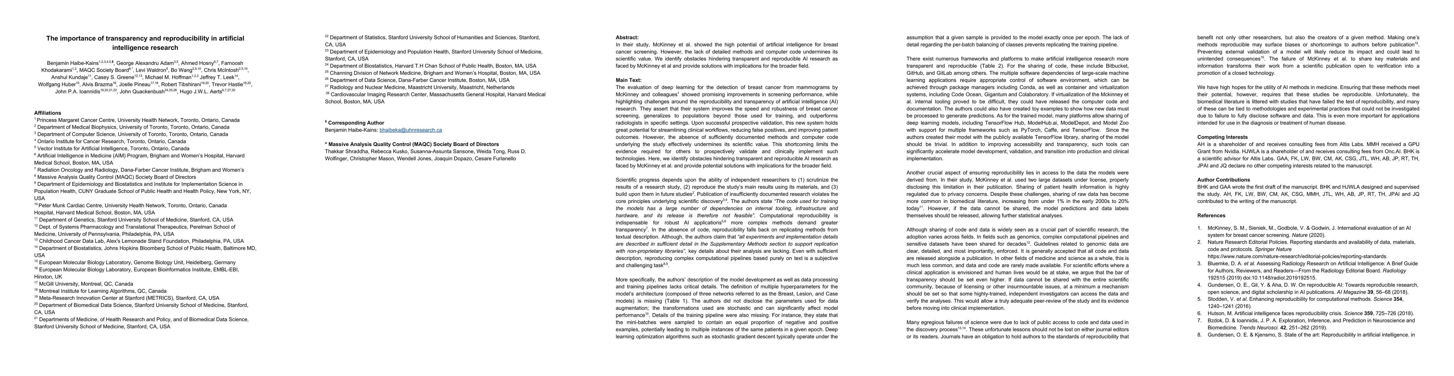 McKinney et al. highlight the potential of AI in breast cancer screening but note the lack of transparency and reproducibility due to insufficient methods and code. This paper identifies obstacles to transparent AI research and proposes solutions to enhance the scientific value and reproducibility across the field.