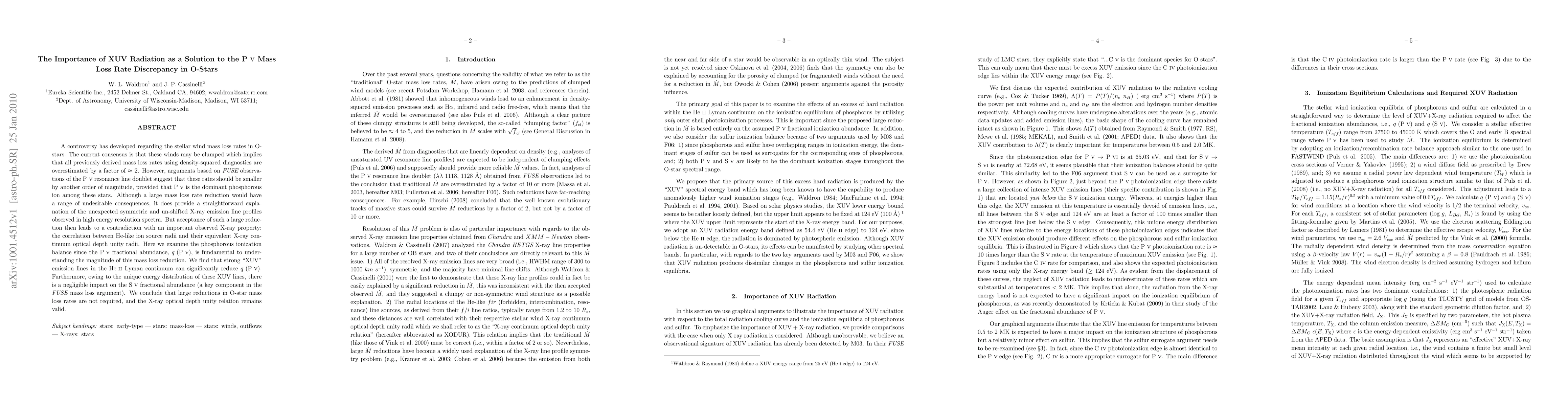 A controversy has developed regarding the stellar wind mass loss rates in O-stars. The current consensus is that these winds may be clumped which implies that all previously derived mass loss rates using density-squared diagnostics are overestimated by a factor of ~ 2. However, arguments based on FUSE observations of the P V resonance line doublet suggest that these rates should be smaller by another order of magnitude, provided that P V is the dominant phosphorous ion among these stars. Although a large mass loss rate reduction would have a range of undesirable consequences, it does provide a straightforward explanation of the unexpected symmetric and un-shifted X-ray emission line profiles observed in high energy resolution spectra. But acceptance of such a large reduction then leads to a contradiction with an important observed X-ray property: the correlation between He-like ion source radii and their equivalent X-ray continuum optical depth unity radii. Here we examine the phosphorous ionization balance since the P V fractional abundance, q(P V), is fundamental to understanding the magnitude of this mass loss reduction. We find that strong "XUV" emission lines in the He II Lyman continuum can significantly reduce q(P V). Furthermore, owing to the unique energy distribution of these XUV lines, there is a negligible impact on the S V fractional abundance (a key component in the FUSE mass loss argument). We conclude that large reductions in O-star mass loss rates are not required, and the X-ray optical depth unity relation remains valid.