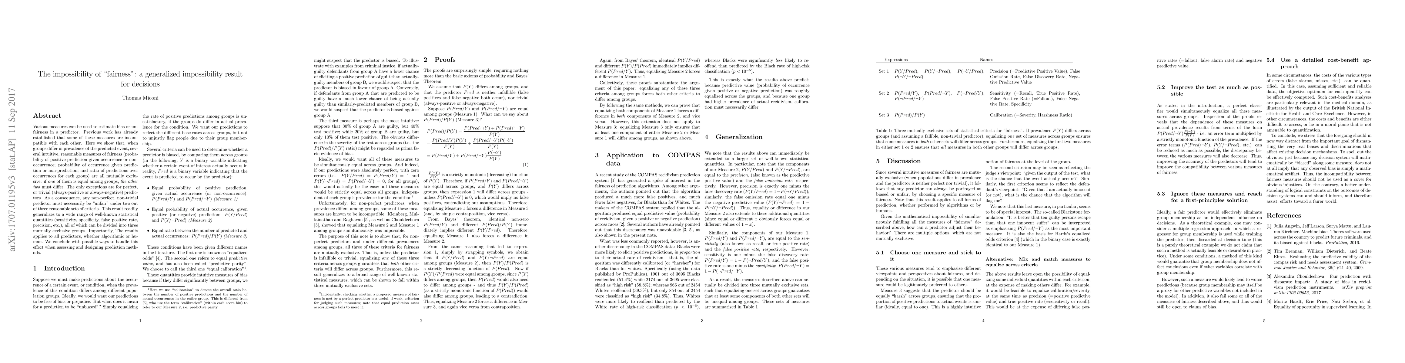 Various measures can be used to estimate bias or unfairness in a predictor. Previous work has already established that some of these measures are incompatible with each other. Here we show that, when groups differ in prevalence of the predicted event, several intuitive, reasonable measures of fairness (probability of positive prediction given occurrence or non-occurrence; probability of occurrence given prediction or non-prediction; and ratio of predictions over occurrences for each group) are all mutually exclusive: if one of them is equal among groups, the other two must differ. The only exceptions are for perfect, or trivial (always-positive or always-negative) predictors. As a consequence, any non-perfect, non-trivial predictor must necessarily be "unfair" under two out of three reasonable sets of criteria. This result readily generalizes to a wide range of well-known statistical quantities (sensitivity, specificity, false positive rate, precision, etc.), all of which can be divided into three mutually exclusive groups. Importantly, The results applies to all predictors, whether algorithmic or human. We conclude with possible ways to handle this effect when assessing and designing prediction methods.