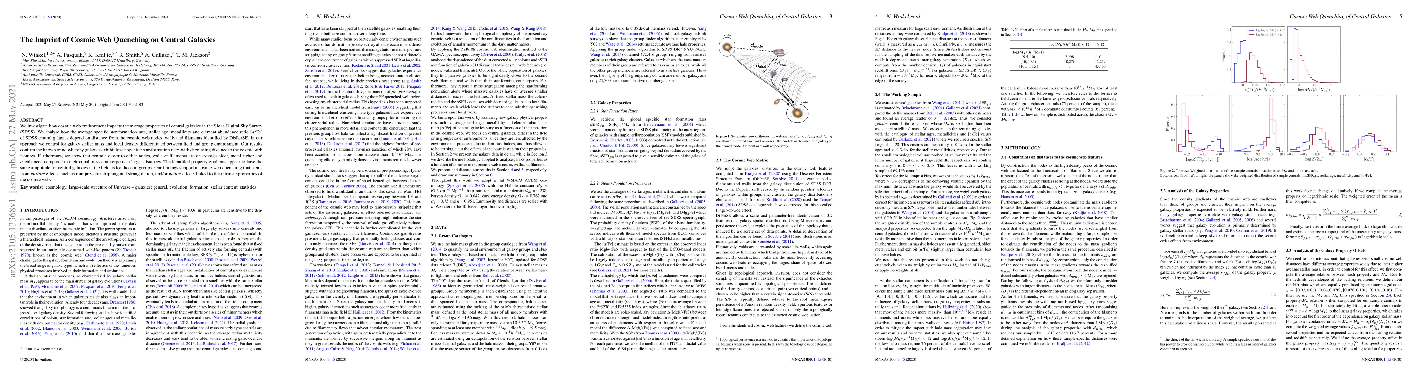 The study uses the Sloan Digital Sky Survey (SDSS) data, focusing on central galaxies' properties concerning their distances from cosmic web nodes, walls, and filaments, identified by DisPerSE. It analyzes specific star-formation rates, stellar ages, metallicity, and [α/Fe] element abundance ratios, controlling for galaxy stellar mass and local density in field and group environments.