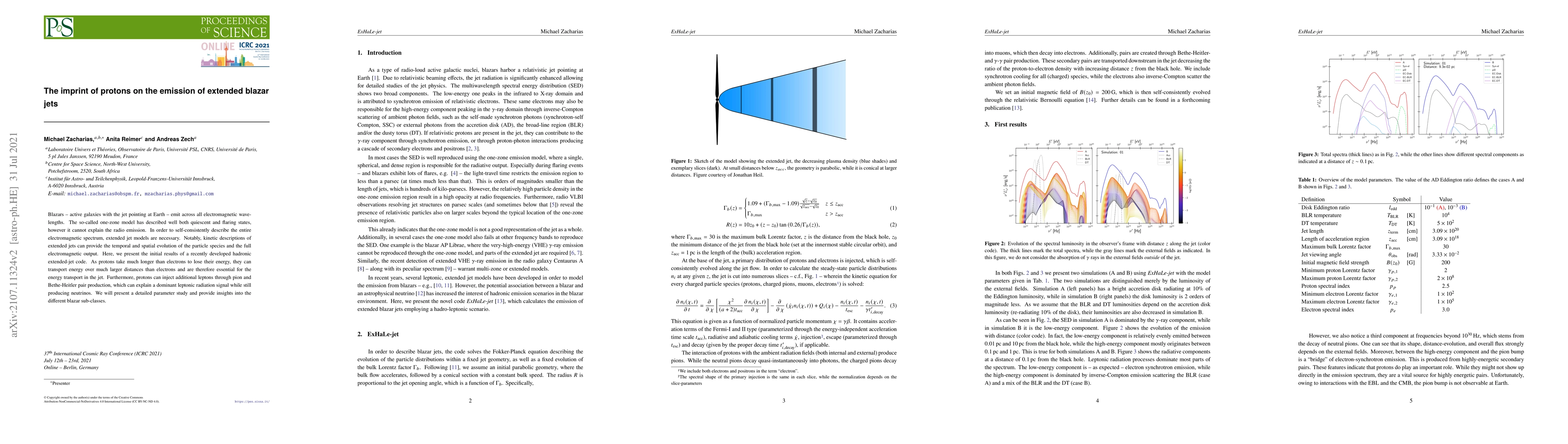 Blazars - active galaxies with the jet pointing at Earth - emit across all electromagnetic wavelengths. The so-called one-zone model has described well both quiescent and flaring states, however it cannot explain the radio emission. In order to self-consistently describe the entire electromagnetic spectrum, extended jet models are necessary. Notably, kinetic descriptions of extended jets can provide the temporal and spatial evolution of the particle species and the full electromagnetic output. Here, we present the initial results of a recently developed hadronic extended-jet code. As protons take much longer than electrons to lose their energy, they can transport energy over much larger distances than electrons and are therefore essential for the energy transport in the jet. Furthermore, protons can inject additional leptons through pion and Bethe-Heitler pair production, which can explain a dominant leptonic radiation signal while still producing neutrinos. We will present a detailed parameter study and provide insights into the different blazar sub-classes.