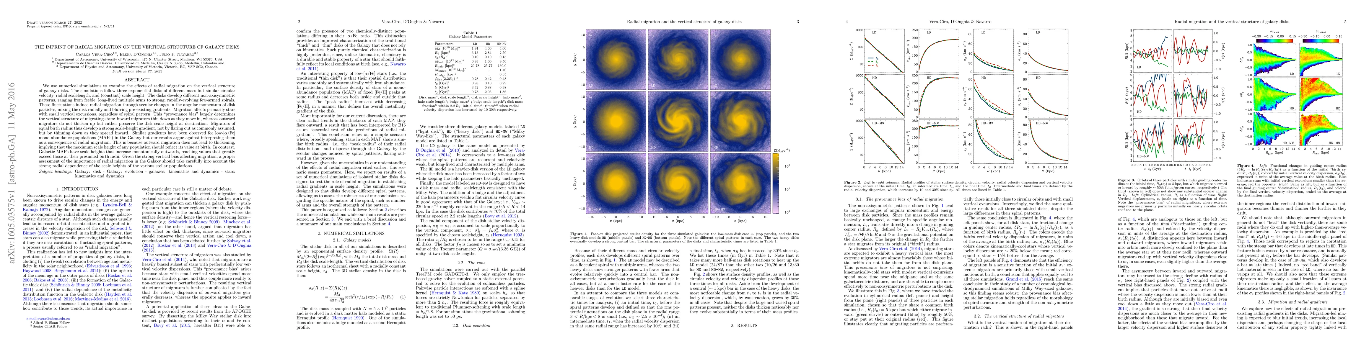 We use numerical simulations to examine the effects of radial migration on the vertical structure of galaxy disks. The simulations follow three exponential disks of different mass but similar circular velocity, radial scalelength, and (constant) scale height. The disks develop different non-axisymmetric patterns, ranging from feeble, long-lived multiple arms to strong, rapidly-evolving few-armed spirals. These fluctuations induce radial migration through secular changes in the angular momentum of disk particles, mixing the disk radially and blurring pre-existing gradients. Migration affects primarily stars with small vertical excursions, regardless of spiral pattern. This "provenance bias" largely determines the vertical structure of migrating stars: inward migrators thin down as they move in, whereas outward migrators do not thicken up but rather preserve the disk scale height at destination. Migrators of equal birth radius thus develop a strong scale-height gradient, not by flaring out as commonly assumed, but by thinning down as they spread inward. Similar gradients have been observed for low-[$\alpha$/Fe] mono-abundance populations (MAPs) in the Galaxy but our results argue against interpreting them as a consequence of radial migration. This is because outward migration does not lead to thickening, implying that the maximum scale height of any population should reflect its value at birth. In contrast, Galactic MAPs have scale heights that increase monotonically outwards, reaching values that greatly exceed those at their presumed birth radii. Given the strong vertical bias affecting migration, a proper assessment of the importance of radial migration in the Galaxy should take carefully into account the strong radial dependence of the scale heights of the various stellar populations.