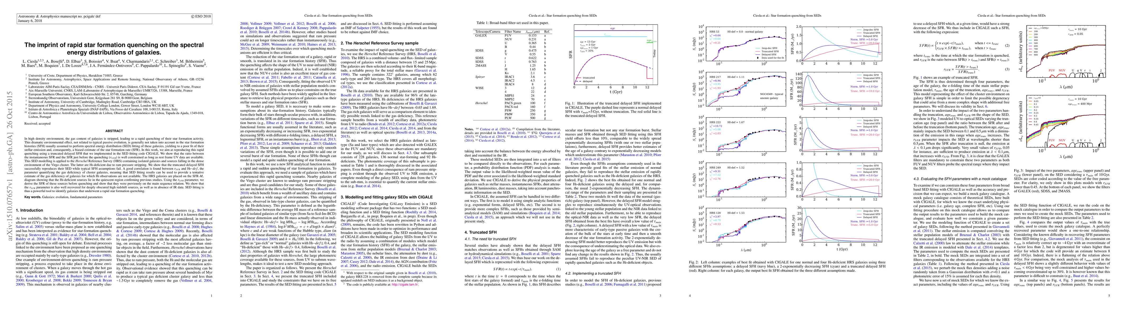[Abridged] In high density environment, the gas content of galaxies is stripped, leading to a rapid quenching of their star formation activity. This dramatic environmental effect is generally not taken into account in the SFHs usually assumed to perform spectral energy distribution (SED) fitting of these galaxies, yielding to a poor fit of their stellar emission and, consequently, a biased estimate of the SFR. We aim at reproducing the SFH of galaxies that underwent a rapid star formation quenching using a truncated delayed SFH that we implemented in the SED fitting code CIGALE. We show that the ratio between the instantaneous SFR and the SFR just before the quenching ($r_{SFR}$) is well constrained as long as rest frame UV data are available. This SED modelling is applied to the Herschel Reference Survey (HRS) containing isolated galaxies and sources falling in the dense environment of the Virgo cluster. The latter are HI-deficient due to ram pressure stripping. We show that the truncated delayed SFH successfully reproduces their SED while typical SFH assumptions fail. A good correlation is found between $r_{SFR}$ and HI-def, the parameter quantifying the gas deficiency of cluster galaxies, meaning that SED fitting results can be used to provide a tentative estimate of the gas deficiency of galaxies for which HI observations are not available. The HRS galaxies are placed on the SFR-$M_*$ diagram showing that the HI-deficient sources lie in the quiescent region confirming previous studies. Using the $r_{SFR}$ parameter, we derive the SFR of these sources before quenching and show that they were previously on the main sequence relation. We show that the $r_{SFR}$ parameter is also well recovered for deeply obscured high redshift sources, as well as in absence of IR data. SED fitting is thus a powerful tool to identify galaxies that underwent a rapid star formation quenching.