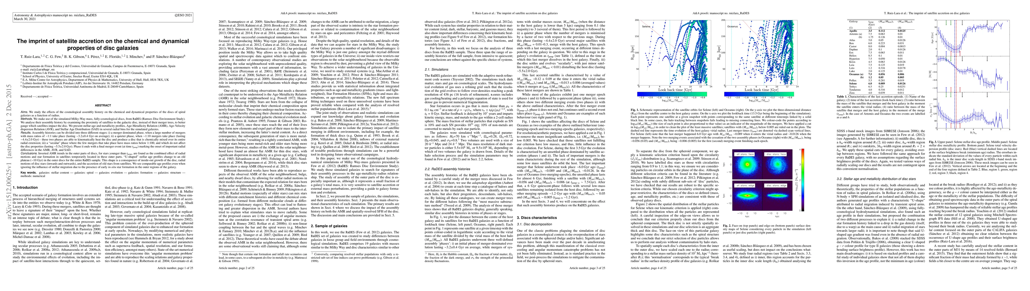 Aims: We study the effects of the cosmological assembly history on the chemical and dynamical properties of the discs of spiral galaxies as a function of radius. Methods: We make use of the simulated Milky-Way mass, fully-cosmological discs, from {\tt RaDES} (Ramses Disc Environment Study). We analyse their assembly history by examining the proximity of satellites to the galactic disc, instead of their merger trees, to better gauge which satellites impact the disc. We present stellar age and metallicity profiles, Age-Metallicity Relation (AMR), Age-Velocity dispersion Relation (AVR), and Stellar Age Distribution (SAD) in several radial bins for the simulated galaxies. Results: Assembly histories can be divided into three different stages: i) a merger dominated phase, when a large number of mergers with mass ratios of $\sim$1:1 take place (lasting $\sim$3.2$\pm$0.4 Gyr on average); ii) a quieter phase, when $\sim$1:10 mergers take place (lasting $\sim$4.4$\pm$2.0 Gyr) - these two phases are able to kinematically heat the disc and produce a disc that is chemically mixed over its entire radial extension; iii) a "secular" phase where the few mergers that take place have mass ratios below 1:100, and which do not affect the disc properties (lasting $\sim$5.5$\pm$2.0 Gyr). Phase ii ends with a final merger event (at time $t_\mathrm{jump}$) marking the onset of important radial differences in the AMR, AVR, and SAD. Conclusions: Inverted AMR trends in the outer parts of discs, for stars younger than $t_\mathrm{jump}$, are found as the combined effect of radial motions and star formation in satellites temporarily located in these outer parts. "U-shaped" stellar age profiles change to an old plateau ($\sim$10 Gyr) in the outer discs for the entire {\tt RaDES} sample. This shape is a consequence of inside-out growth of the disc, radial motions of disc stars ... [abridged]
