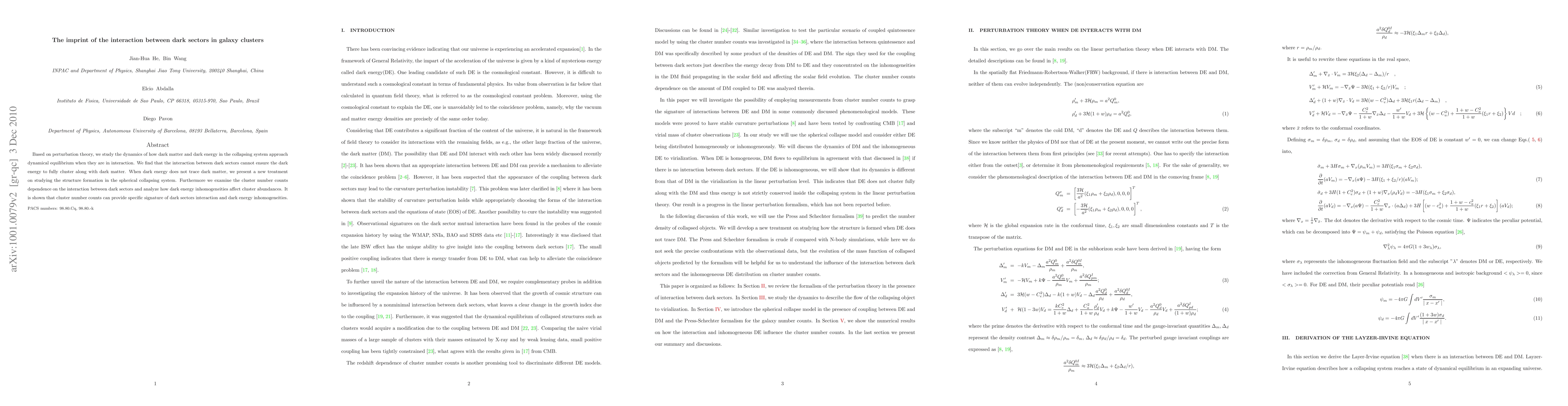 Based on perturbation theory, we study the dynamics of how dark matter and dark energy in the collapsing system approach dynamical equilibrium while interacting. We find that the interaction between dark sectors cannot ensure the dark energy to fully cluster along with dark, leading to the energy non-conservation problem in the collapsing system We examine the cluster number counts dependence on the interaction between dark sectors. Furthermore, we analyze how dark energy inhomogeneities affect cluster abundances. It is shown that cluster number counts can provide specific signature of dark sectors interaction and dark energy inhomogeneities.