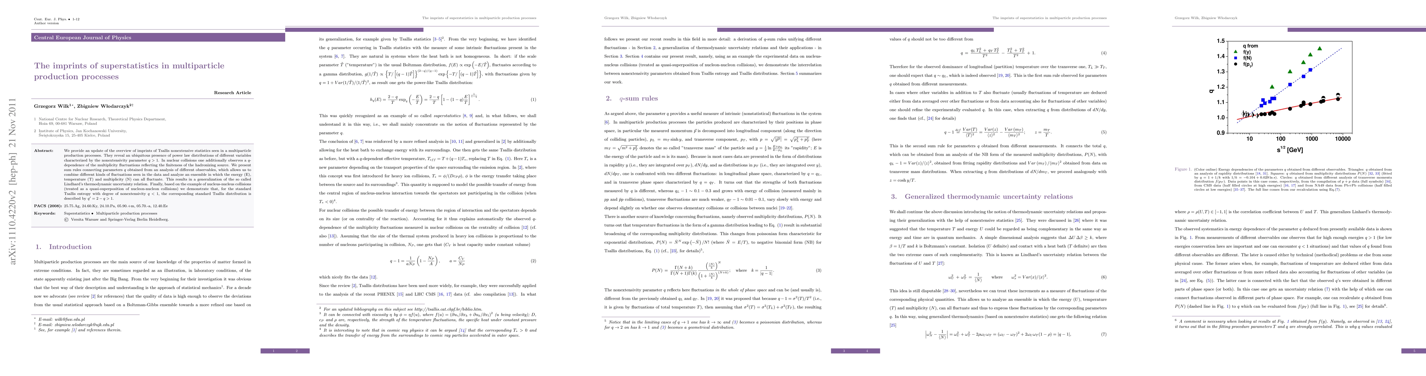 We provide an update of the overview of imprints of Tsallis nonextensive statistics seen in a multiparticle production processes. They reveal an ubiquitous presence of power law distributions of different variables characterized by the nonextensivity parameter q > 1. In nuclear collisions one additionally observes a q-dependence of the multiplicity fluctuations reflecting the finiteness of the hadronizing source. We present sum rules connecting parameters q obtained from an analysis of different observables, which allows us to combine different kinds of fluctuations seen in the data and analyze an ensemble in which the energy (E), temperature (T) and multiplicity (N) can all fluctuate. This results in a generalization of the so called Lindhard's thermodynamic uncertainty relation. Finally, based on the example of nucleus-nucleus collisions (treated as a quasi-superposition of nucleon-nucleon collisions) we demonstrate that, for the standard Tsallis entropy with degree of nonextensivity q < 1, the corresponding standard Tsallis distribution is described by q' = 2 - q > 1.