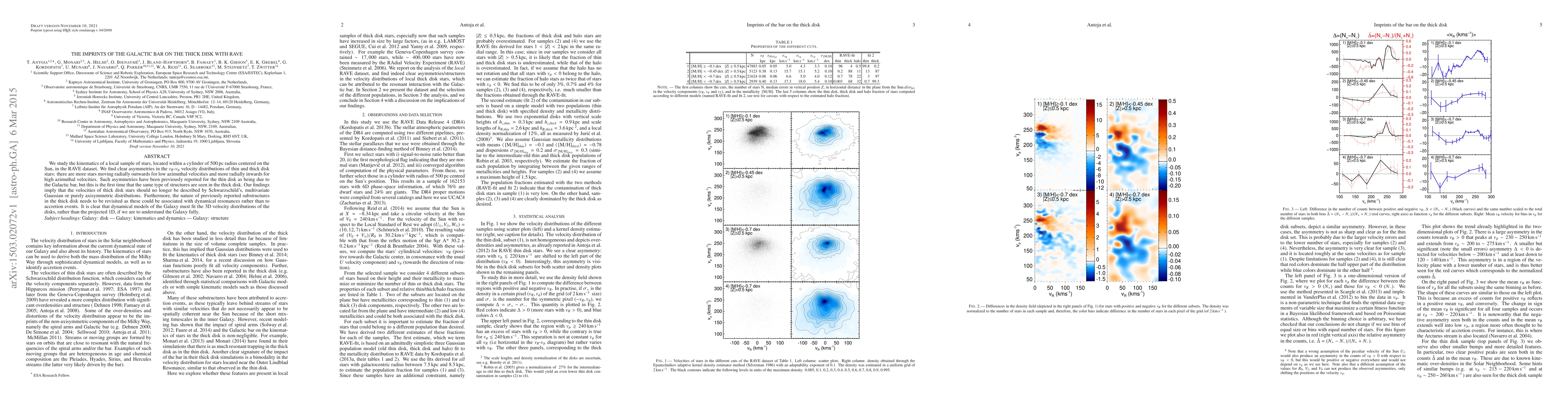 We study the kinematics of a local sample of stars, located within a cylinder of 500 pc radius centered on the Sun, in the RAVE dataset. We find clear asymmetries in the $v_R$-$v_\phi$ velocity distributions of thin and thick disk stars: here are more stars moving radially outwards for low azimuthal velocities and more radially inwards for high azimuthal velocities. Such asymmetries have been previously reported for the thin disk as being due to the Galactic bar, but this is the first time that the same type of structures are seen in the thick disk. Our findings imply that the velocities of thick disk stars should no longer be described by Schwarzschild's, multivariate Gaussian or purely axisymmetric distributions. Furthermore, the nature of previously reported substructures in the thick disk needs to be revisited as these could be associated with dynamical resonances rather than to accretion events. It is clear that dynamical models of the Galaxy must fit the 3D velocity distributions of the disks, rather than the projected 1D, if we are to understand the Galaxy fully.