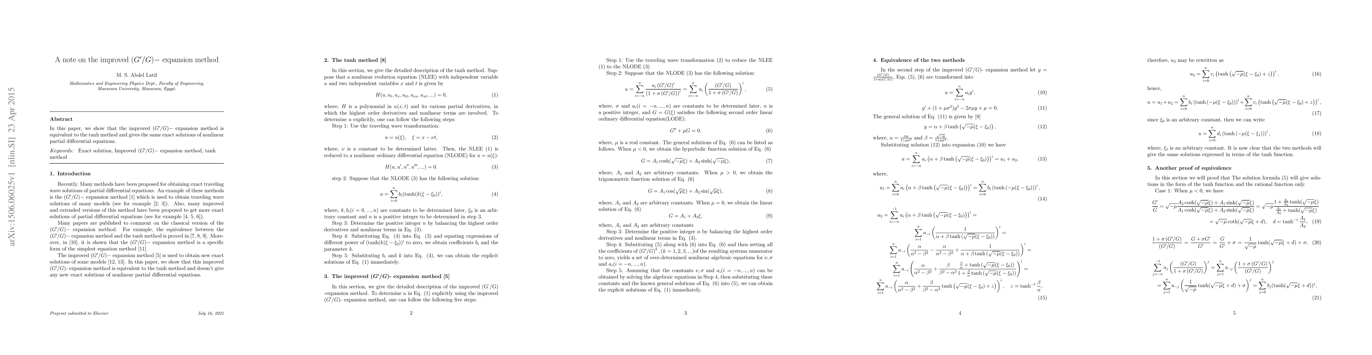 Summary: This paper demonstrates the equivalence between the improved (G'/G)-expansion method and the tanh method, showing they yield identical exact solutions for nonlinear partial differential equations.