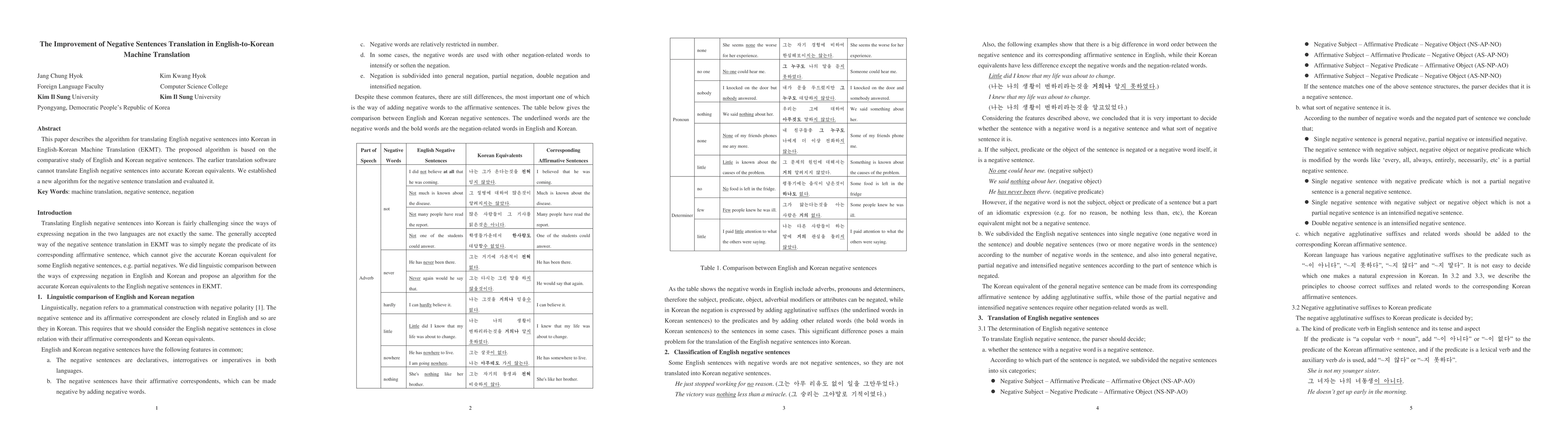 This paper describes the algorithm for translating English negative sentences into Korean in English-Korean Machine Translation (EKMT). The proposed algorithm is based on the comparative study of English and Korean negative sentences. The earlier translation software cannot translate English negative sentences into accurate Korean equivalents. We established a new algorithm for the negative sentence translation and evaluated it.