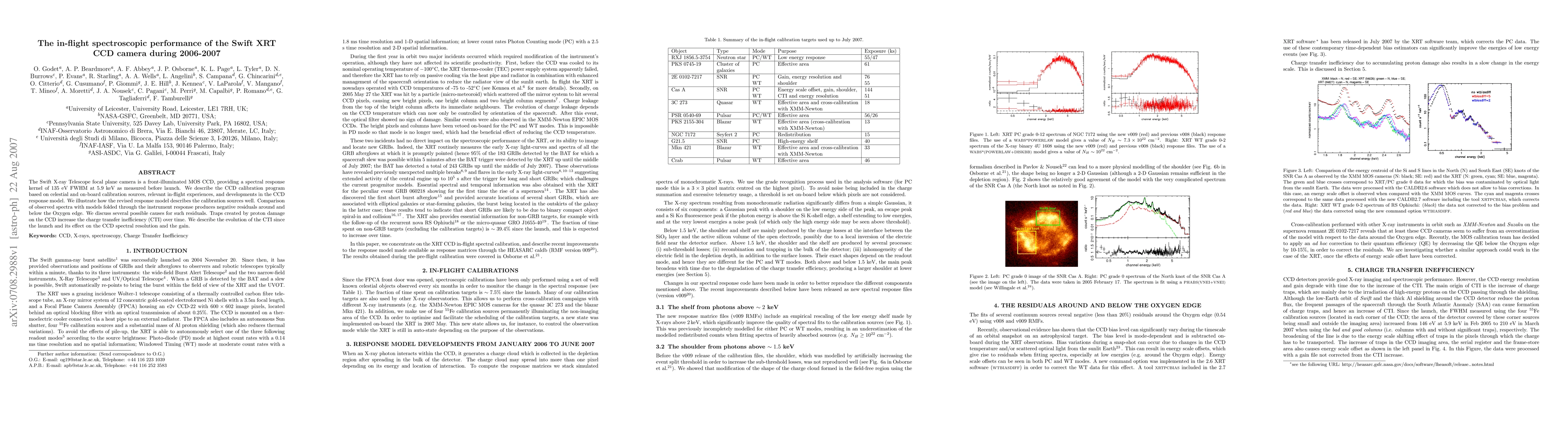 This paper examines the calibration and performance of the Swift XRT CCD camera from 2006-2007, detailing the spectral response and the impact of proton damage-induced traps on charge transfer inefficiency, which affects spectral resolution and gain. It also discusses discrepancies between observed spectra and models, attributing some to these efficiency changes.