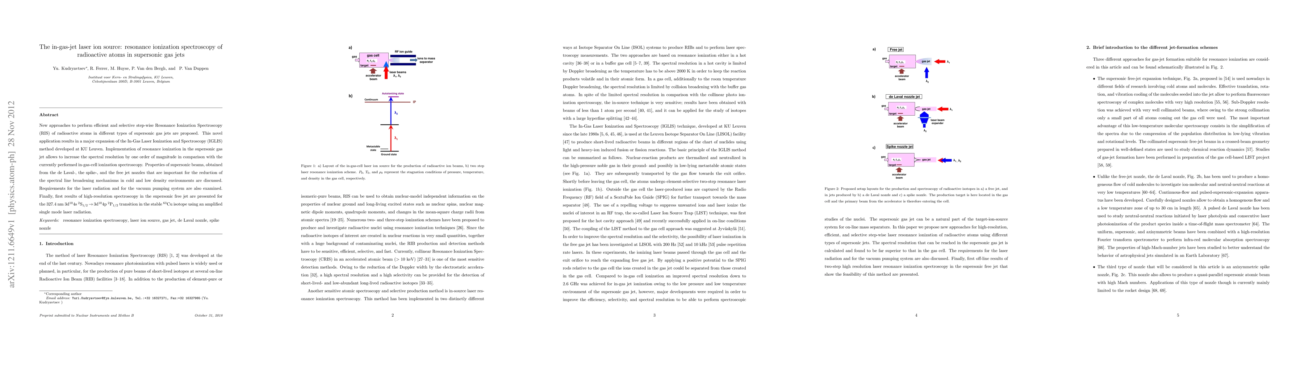 New approaches to perform efficient and selective step-wise Resonance Ionization Spectroscopy (RIS) of radioactive atoms in different types of supersonic gas jets are proposed. This novel application results in a major expansion of the In-Gas Laser Ionization and Spectroscopy (IGLIS) method developed at KU Leuven. Implementation of resonance ionization in the supersonic gas jet allows to increase the spectral resolution by one order of magnitude in comparison with the currently performed in-gas-cell ionization spectroscopy. Properties of supersonic beams, obtained from the de Laval-, the spike-, and the free jet nozzles that are important for the reduction of the spectral line broadening mechanisms in cold and low density environments are discussed. Requirements for the laser radiation and for the vacuum pumping system are also examined. Finally, first results of high-resolution spectroscopy in the supersonic free jet are presented for the 327.4 nm 3d^{10}4s^{2}S_{1/2} \rightarrow 3d^{10}4p^{2}P_{1/2} transition in the stable 63Cu isotope using an amplified single mode laser radiation.
